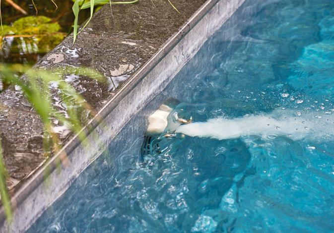 Einen Schwimmteich zu besitzen kann schön sein, auf Dauer aber auch anstrengend. Seine Wasserqualität ist mit der eines konventionellen Swimmingpool kaum zu vergleichen. Je nach Bauart muss man akzeptieren, dass das Wasser immer etwas grünlich und die Teichfolie manchmal etwas rutschig ist und sich bei ungenügender Pflege plötzlich Algen bilden. Das strapaziert den Zustand des Wassers und seiner Teichbiologie – und damit auch das Gemüt seiner Besitzer. Zehn Jahre lang akzeptierte die Familie aus dem Sächsischen diese typischen Eigenschaften des Phänomens Schwimmteich, ehe sich der Wunsch durchsetzte, in einem Pool von anderer Wasserqualität zu baden: klarer, reiner und mit weniger Pflegeaufwand sollte der Wellnessalltag künftig gestaltet sein. Weil sie nichtsdestoweniger Naturliebhaber sind, die einen üppig bepflanzten grünen Garten sehr zu schätzen wissen, reifte die Idee, den alten Schwimmteich in zwei Zonen aufzuteilen: in einen Swimmingpool mit konventioneller Wasseraufbereitung und einen Gartenteich mit mit viel Natur. „Den Eindruck des naturnahen Wasserbeckens wollten wir nämlich schon gerne behalten. Es sollte nicht nur ein blaues Schwimmbecken werden“, erklärt der Bauherr. Mit der Planung und Gestaltung beauftragten sie den Leipziger SopraPartner Geyger Poolwelt. Er baute ihnen ein großes, betoniertes Freiformbecken mit Gegenstromanlage in den Garten, das er mit einer zwei Millimeter starken, Schwimmbadfolie in Anthrazit auskleidete. In Kombination mit einer Beckenumrandung aus Naturstein sorgte er so dafür, dass der natürliche Charme des früheren Schwimmteichs erhalten blieb. Zumal der alte Teich um den Pool herum erhalten blieb. Als Wasseraufbereitung wählte er einen umweltfreundlichen Sandfilter mit AFM als mechanischem Filtermedium. AFM („Activated Filter Media“) besteht aus feinkörnigem grünem Altglas. Weil es in der Lage ist, sehr kleine Partikel aus dem Poolwasser zu entfernen, bedarf es nur noch einer geringen Menge an Chlor, die zur anschließenden Desinfektion des Poolwassers hinzugefügt werden muss. Kurzum: Trotz des Umbaus von einer „grünen“ in eine „blaue“ Poolanlage müssen die Besitzer auch in Zukunft nicht auf ihren Naturgenuss verzichten. ❮❮