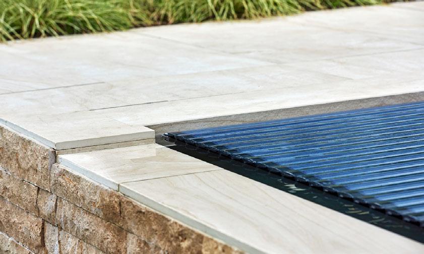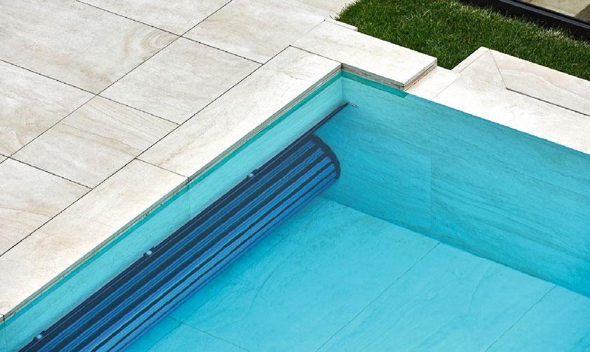 Kleines Bild oben: In aufgerolltem Zustand nimmt die Rollladenabdeckung nicht viel Platz in Anspruch. Einheitlich gestaltet sind die Fliesen im Becken und auf dem Boden rund um den Pool.
