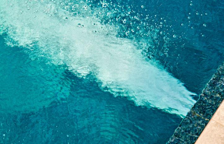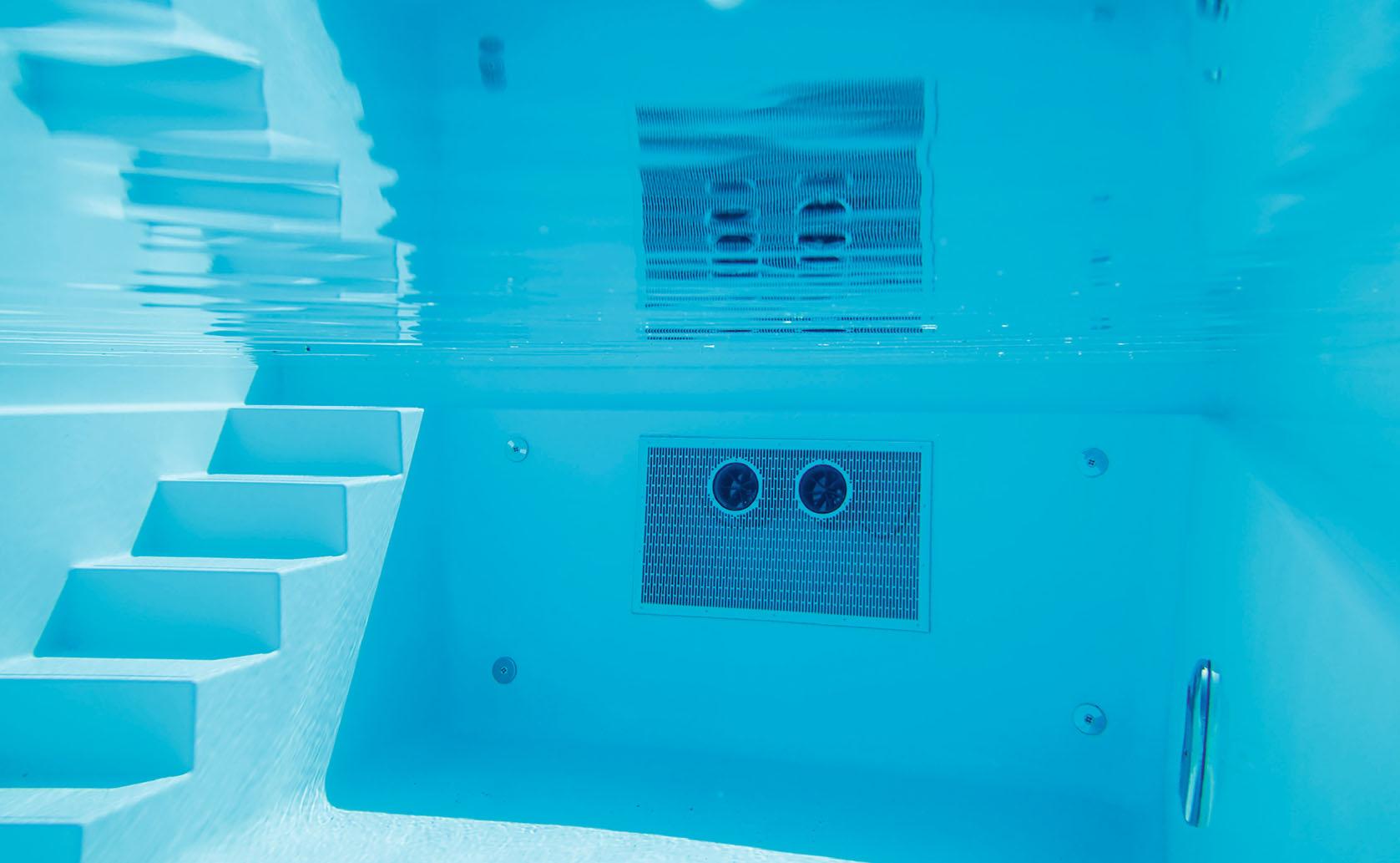 1Die Gegenstromanlage funktioniert mit Turbinentechnologie. Sie erzeugt einen breiten Wasserstrahl, der den Körper ähnlich wie eine natürliche Flussströmung gleichmäßig im Wasser trägt.