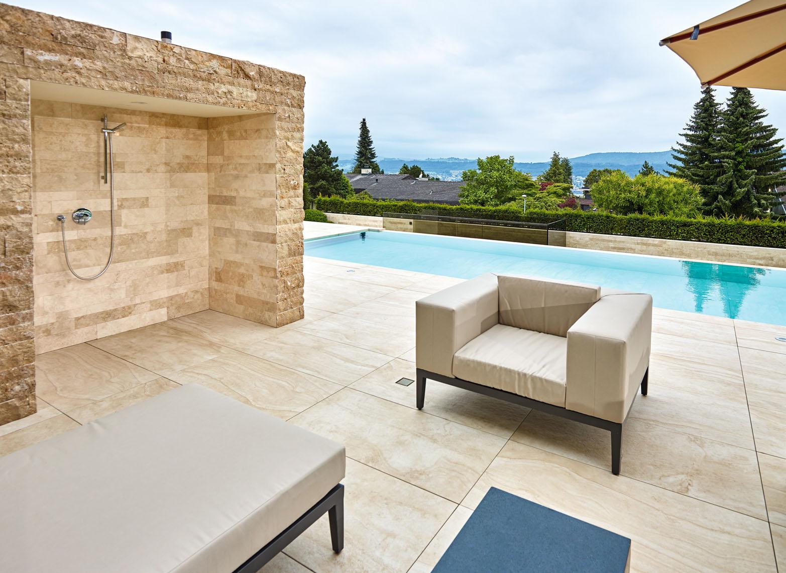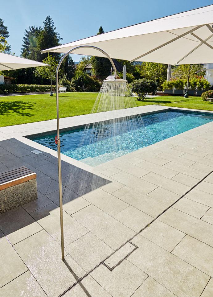 Kleines Bild unten: Bei der Überlaufrinne an einer Längsseite des Pools wurde viel Wert auf eine exakte Ausführung in anspruchsvollem Design gelegt.
