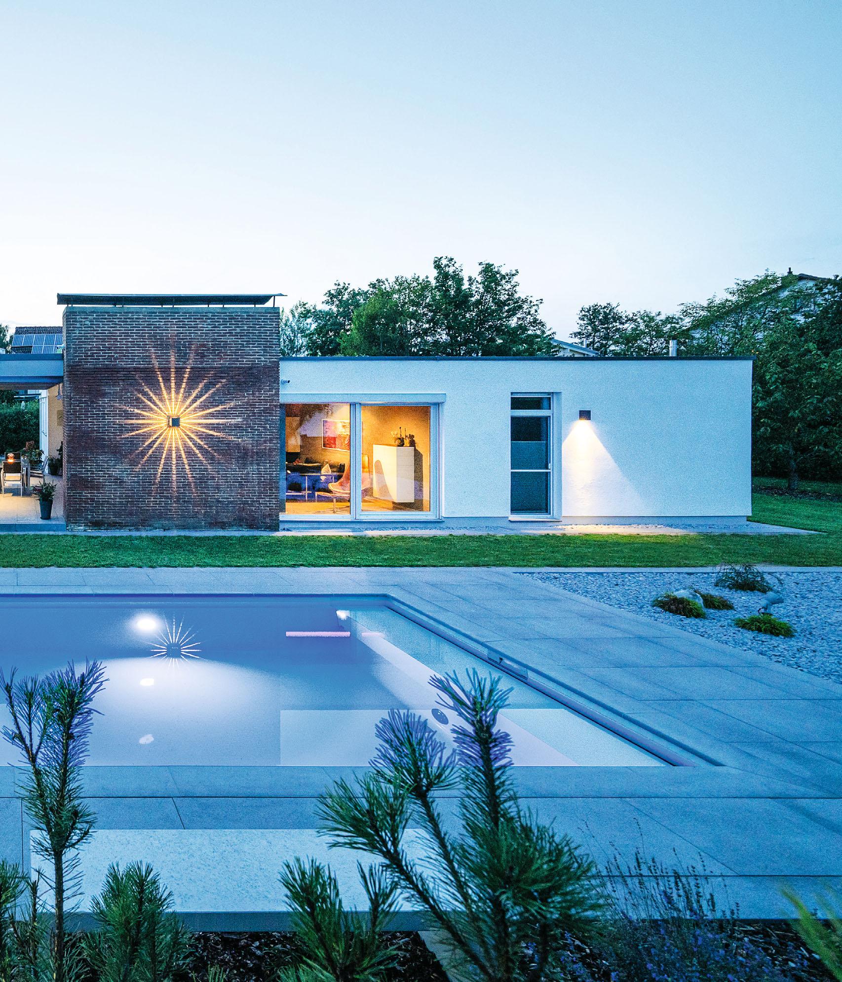 Man erkennt, dass hinter der Beleuchtung von Haus und Pool fachliches Know-how steht. Der Bauherr ist Elektromeister und hat das Lichtkonzept selbst gestaltet.
