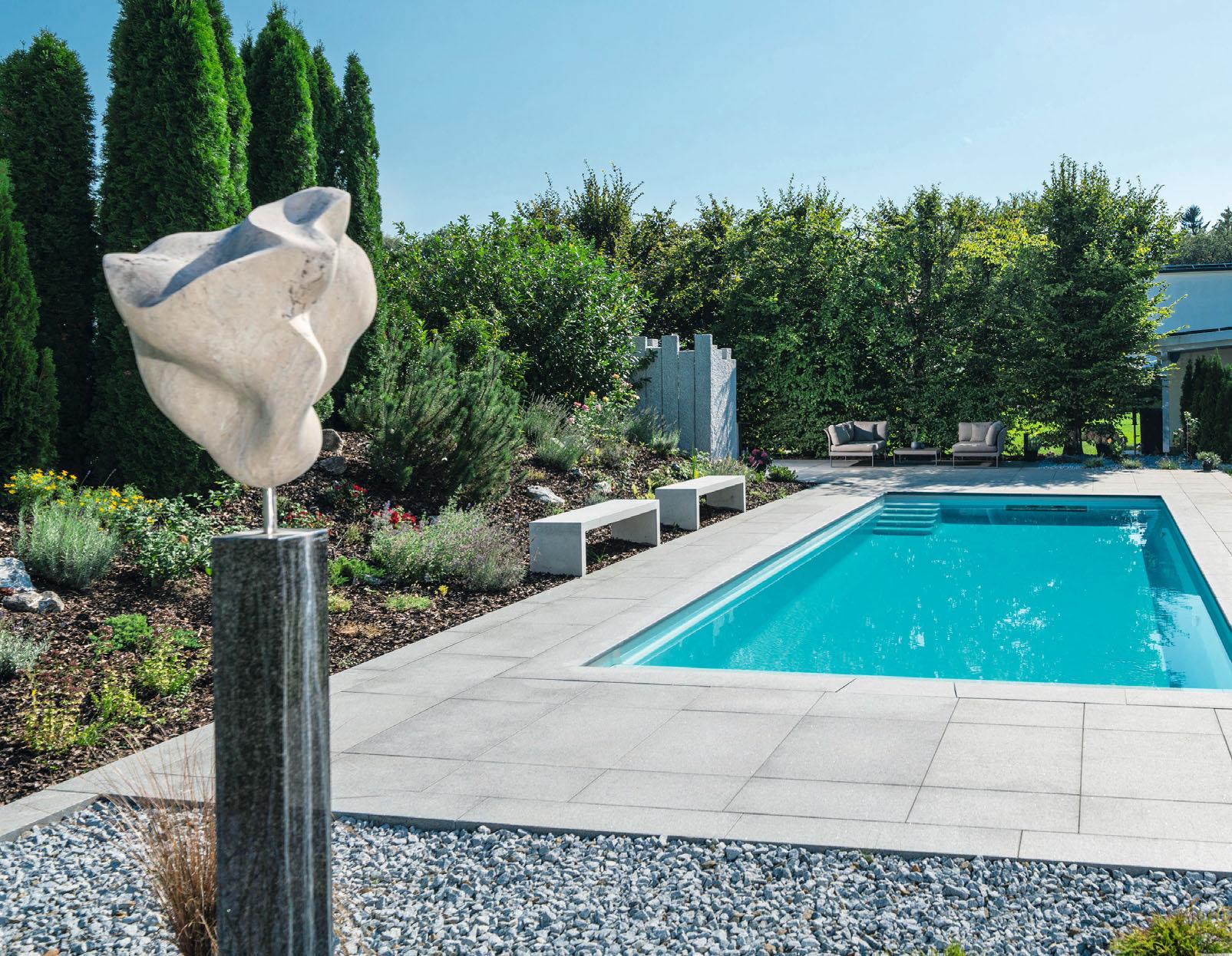 Die Ansprüche der Bauherren an das neue Schwimmbecken waren daher klar definiert Die Kinder sollten darin toben und planschen können. Sportliches Schwimmtraining war ebenfalls gewünscht. Und insgesamt sollte es ein Spaß für die ganze Familie sein. Im Vordergrund standen die Faktoren Freizeit, Wellness, Wohlfühlen. Mit dem Schwimmbadbau wurden die Experten der Firma Poolcultur GmbH beauftragt. Damit hatten die Bauherren von der Beratung über die Planung bis zur Realisierung und Betreuung einen einzigen Ansprechpartner – und alles aus einer Hand. Zusammen mit verschiedenen Fachpartnerfirmen erstellte Poolcultur eine individuelle Komplettlösung für die Familie. Die Wahl fiel auf ein zehn Meter langes Fertigbecken aus Kunststoff. Den sportlichen Anspruch erfüllt eine Gegenstromanlage mit zwei leistungsstarken Turbinen. Auch die Wahl des Standorts war wichtig. Christoph Lämmle, Geschäftsführer von Poolcultur: „Dem Bauherrn war es wichtig, dass der Pool viel Abendsonne bekommt. So kann man ihn lange nutzen.“ Das Becken wurde in wenigen Metern Entfernung vom Haus platziert, umgeben von einer Umrandung aus Granit und Lounge-Ecken, in denen man laue Sommerabende so richtig genießen kann. ❮❮