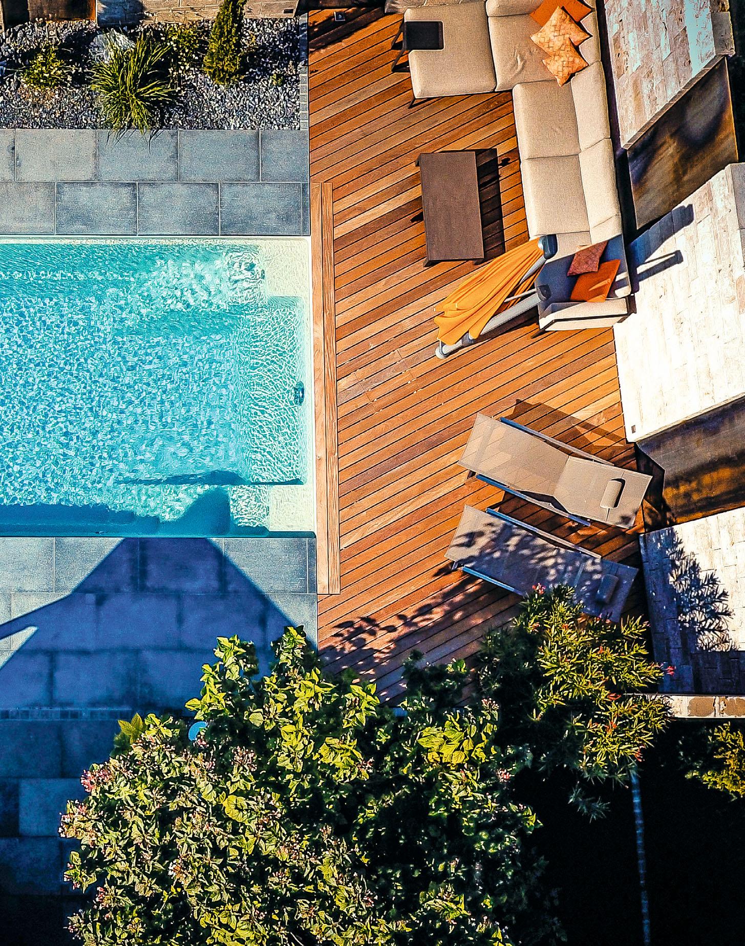 Aus der Vogelperspektive sieht man sehr gut die Aufteilung des Gartens mit Pool, Terrasse und Bepflanzung. Der Einstiegsbereich des Pools (links) ist mit zwei großzügigen seitlichen Treppen und einer Sitzbank gestaltet.