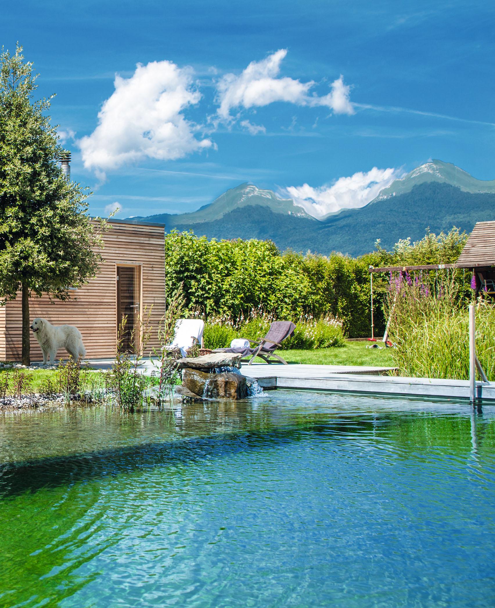 Besonders gelungen ist die Verbindung der Bereiche Sauna, Garten und Naturpool. Über eine Holzterrasse gelangt man nach dem Saunagang zur Abkühlung in das Naturgewässer.