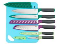 Set includes: Chef's 20cm, Bread 20cm, Carving 20cm, Santoku 17cm, Utility 12cm, Paring 9cm, 6 Blade Protection Sleeves, Cutting Mat 33 x 24cm High quality, rust-resistant blades
