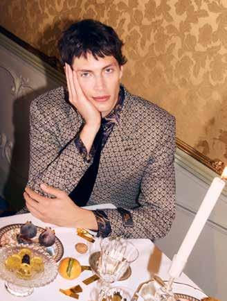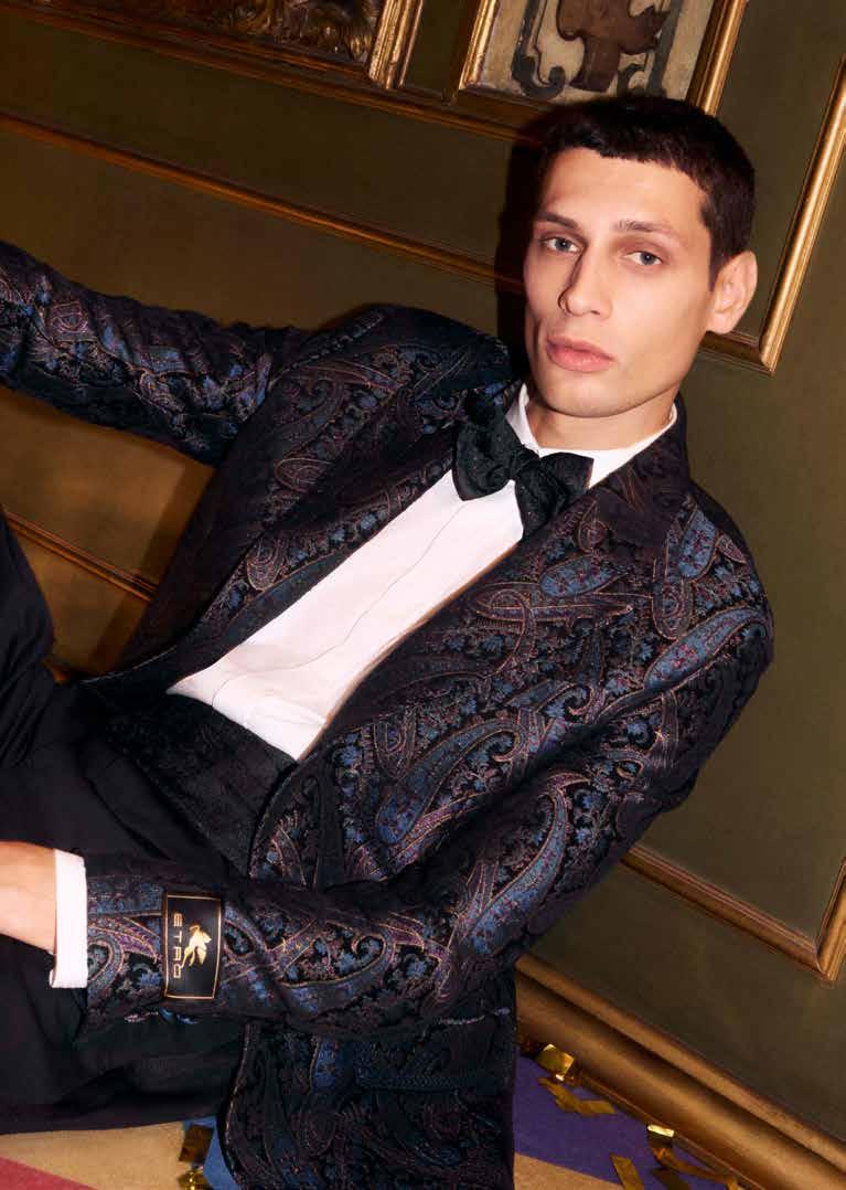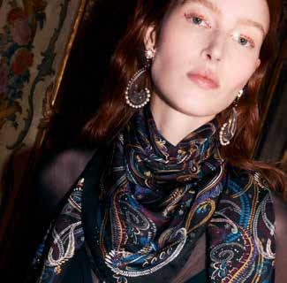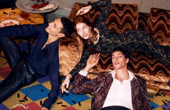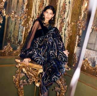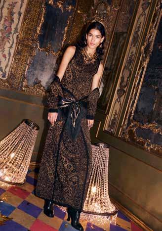 Paisley patterns are reimagined in jewel tones. Velvets and silks drape effortlessly. Lace, ruffles and dazzling yarns weave a textural magic, accentuated by sophisticated embroidery and jacquard motifs. The pieces are playful and distinctly celebratory with glittering accents for both men and women setting the party tone in sharply tailored jackets and exquisitely cut gowns. Accessories include unique pieces of intricate craftsmanship, such as the Vela Bag adorned with leather maxi paillettes and the Kalispera Bag with beaded fringes and braided details. The campaign, set within a decadent palazzo, is an ode to the warm and intimate moments that follow a grand celebration as the narrative unfolds in the joyful aftermath of an end-of-theyear party. ✤