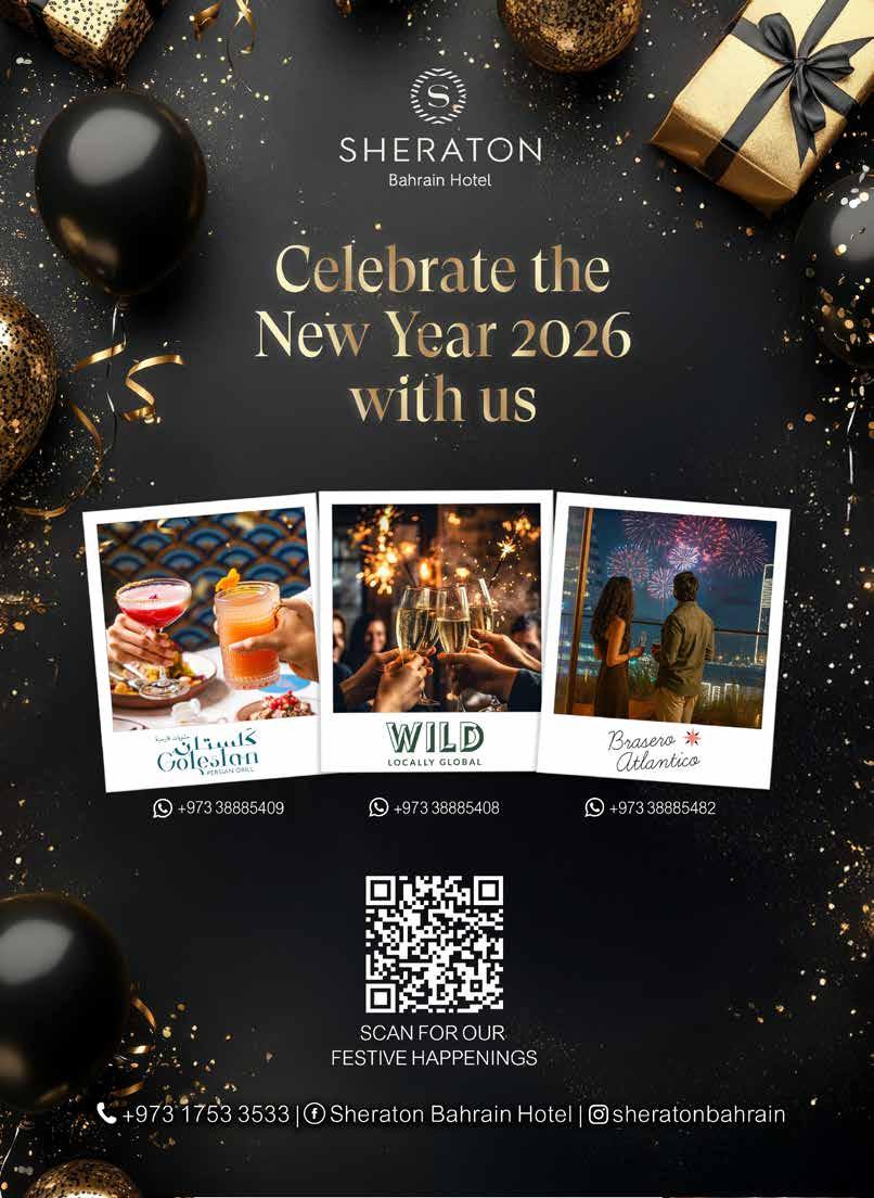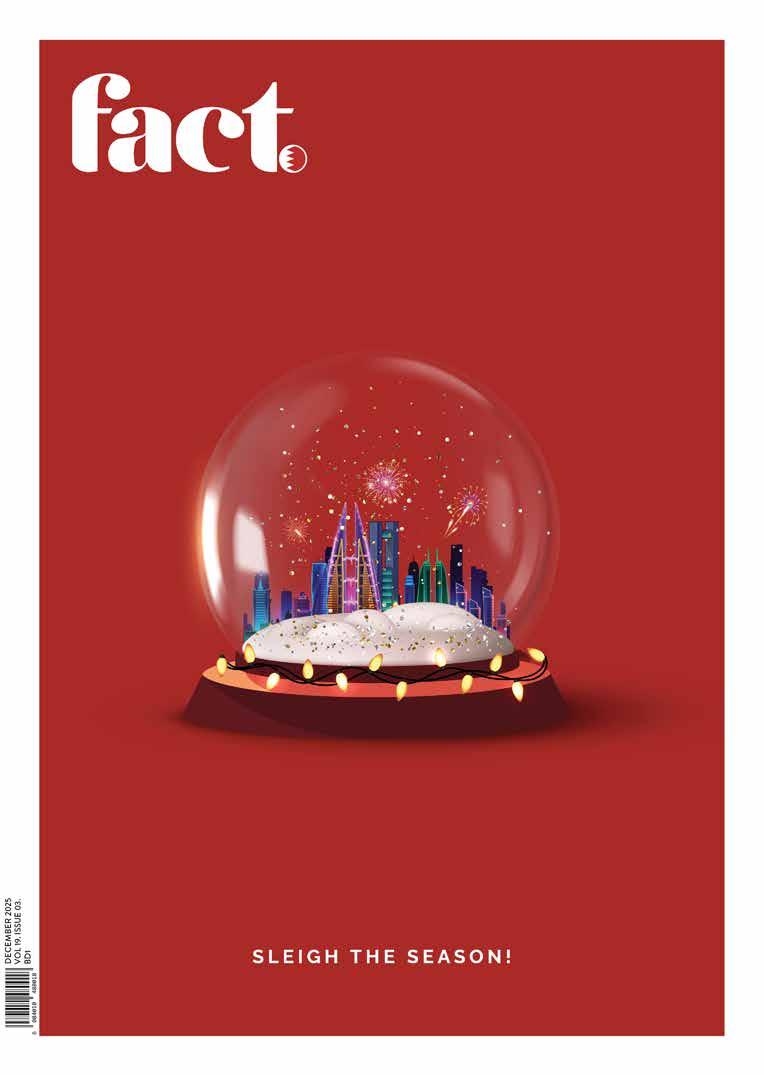 This month, we embrace the holiday spirit in our cover story, bringing you everything from tree-lightings and gingerbread-decorating to scrumptious Christmas dining offers and His & Hers gift guides. Adding to the cheer, we’re launching our annual fact’s Festive Giveaways, a special treat for our readers throughout the month, with daily prizes to be won on Instagram. The month also marks the 54th Bahrain National Day, with celebrations taking place across the island. And as the year winds down, we’ve rounded up some of the hottest New Year’s Eve parties around town. There’s plenty happening on the events front. Festive fairs and markets are back, South African singing sensation Tyla hits our shores and the Kingdom hosts the first Bahrain Coffee Festival. The Farmers’ Market returns for its 13th edition and fans of the Darts Masters can get a head start with news of its 2026 return and early bird tickets.