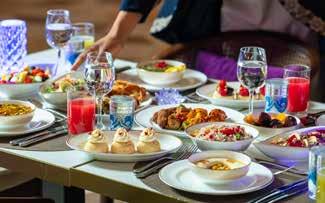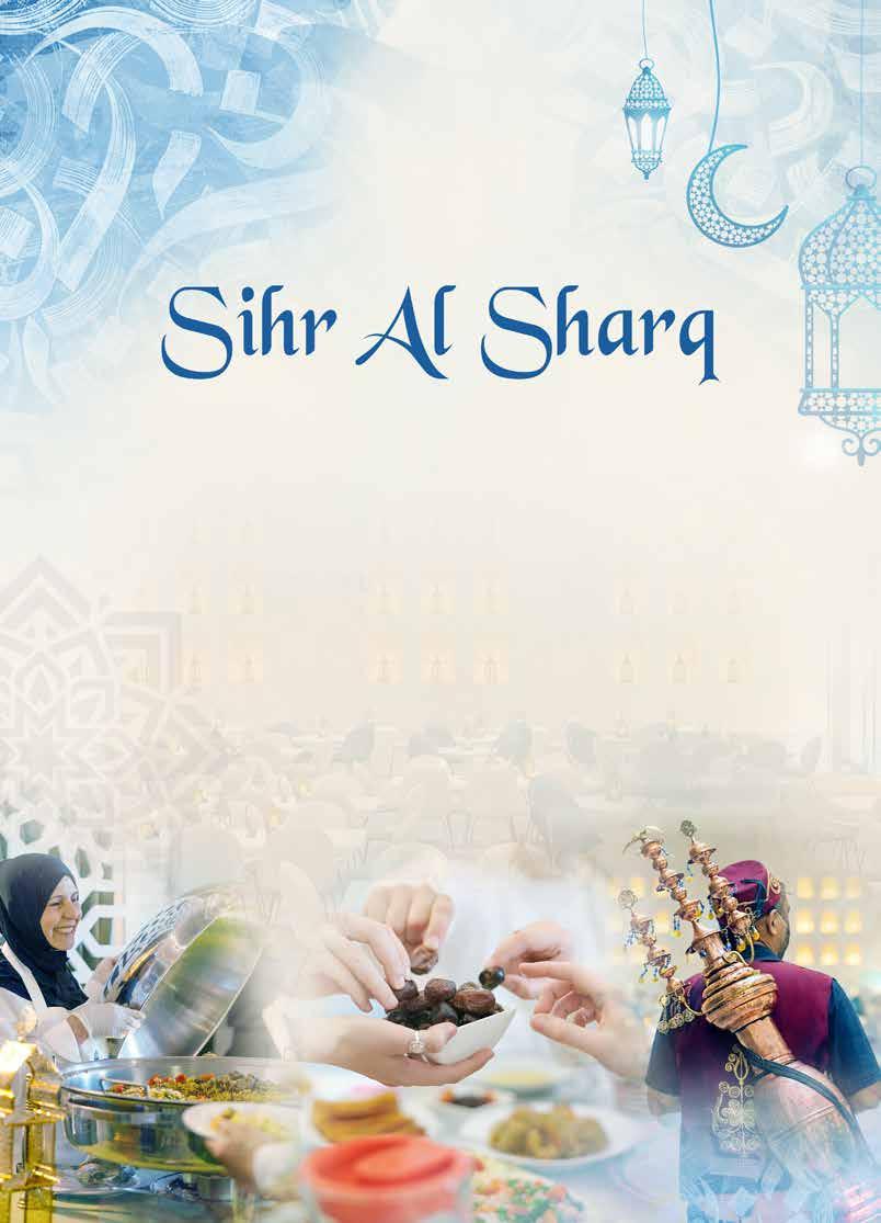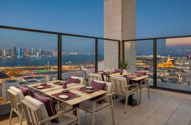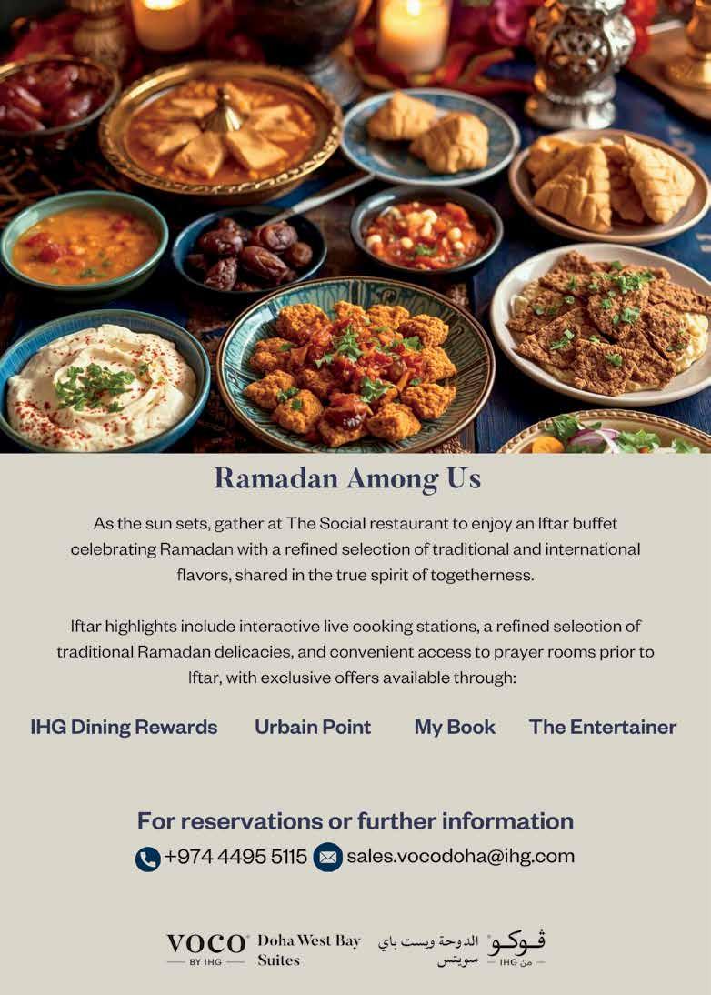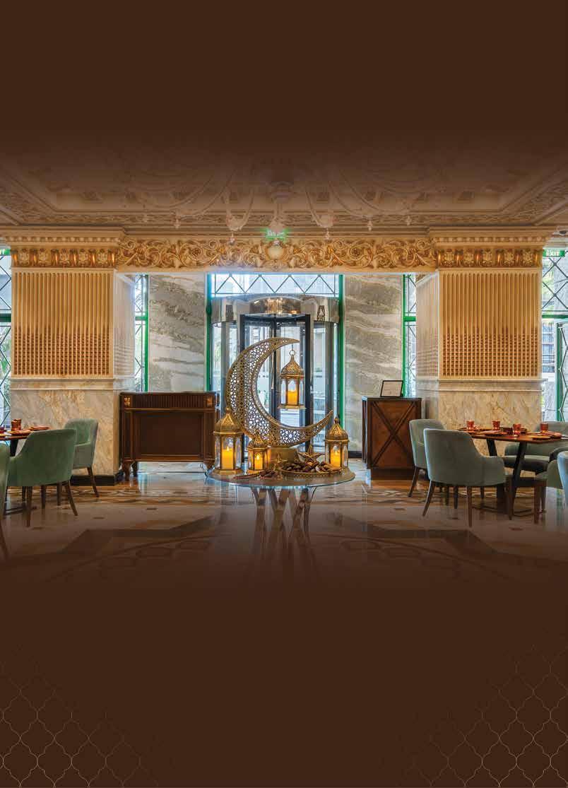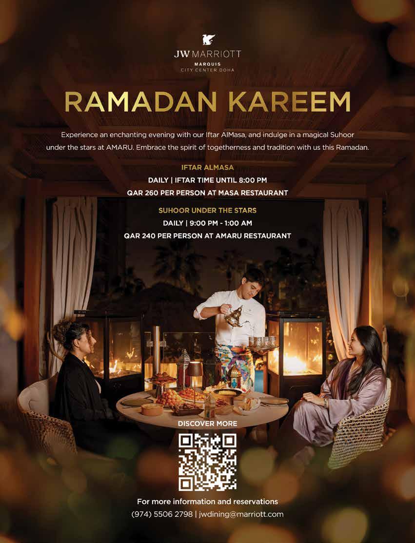 Experience the spirit of Ramadan at Zawaya Ramadan Tent in an open-air setting on the 8th �oor with sweeping views of Doha’s skyline, o�ering generous Iftar and Sohour bu�ets, inspired by traditional Ramadan favorites amidst a warm ambience.