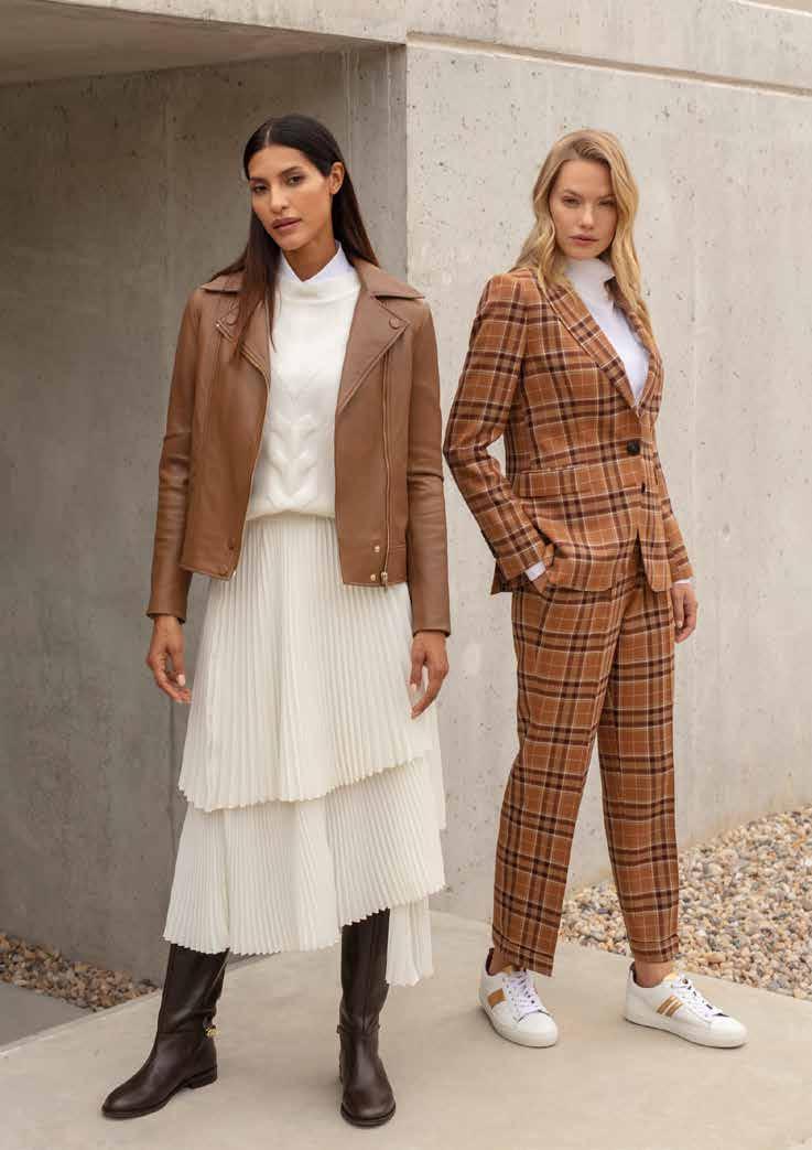 For women, sophisticated buttery-soft leather jackets that feature statement hardware details are designed in tailoring-inspired silhouettes and finished with a classic biker fit. Tonal two-piece blazer sets, utility jackets, tops with unique necklines, knitted sweaters and loose-fit dresses are must-have styles for now and classic designs you’ll wear forever.