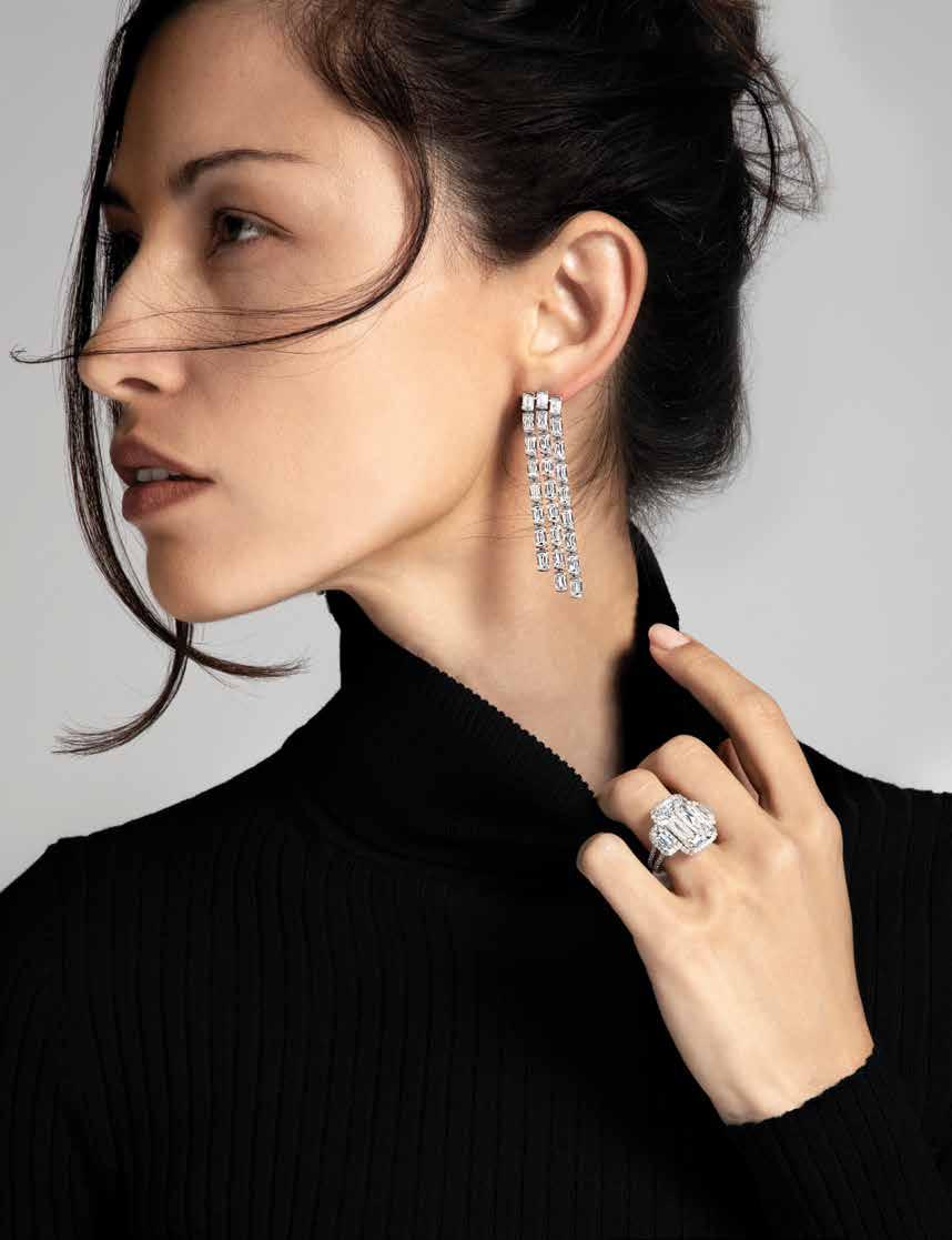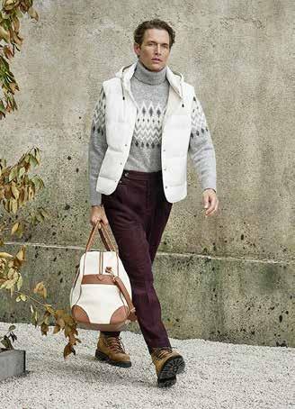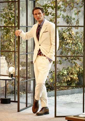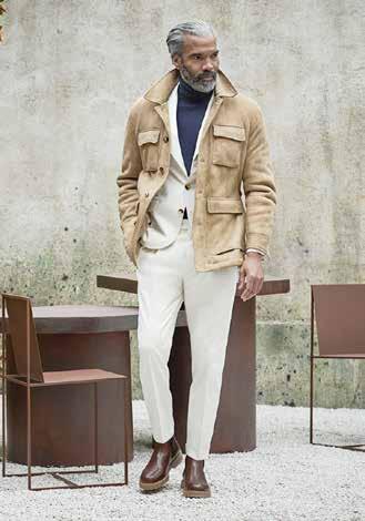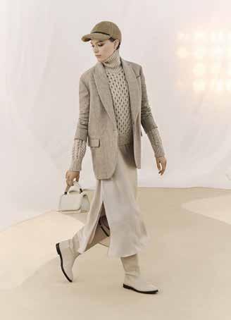 ageing process that enhances the finest and most subtle nuances. The overall harmony is created by precious tones of beige moving from medium camel and sand to light Panama and ecru, accompanied by fascinating shades of noble deep blue and modern light blue. Urban hues of grey complement the backdrop. The suit confirms its role as the cornerstone of the collection while the knitwear selection has been expanded with noble fibres such as virgin wool, silk and alpaca. And elegant styles dedicated to evening and gala events recreate the fusion of glamour and charisma iconic to 1950s’ and 1960s’ Hollywood. ✤