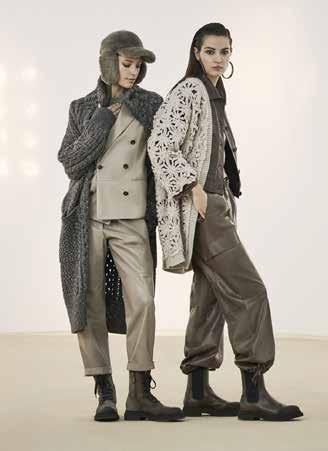 Matching sets with straight lines and monochrome or tone-ontone effects come to life with compact fabrics, twisted wool yarns and mirrored surfaces. In contrast, bouclé, mottled and brushed effects, quilted fabrics, airy mohair, alpaca yak fibres, super-soft shearlings and fleecy materials evoke the dynamic and natural spirit of the countryside. Traditional patterns and details balance femininity and freshness with subtly flared or pencil skirts, shimmering textures and smooth, flowing surfaces. For the evening, traditional men's tailoring fabrics, enriched with precious embroidery, are glamorously interpreted to create new