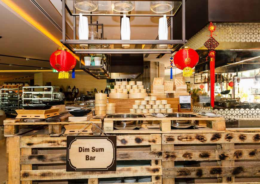 Inside the restaurant itself, an international buffet overwhelms guests with everything from the expected salads and cold cuts, through to a make-your-own hummus station, sumptuous Indian corner and an Asian section featuring dim sum, spicy noodles and a Peking duck that is bound to delight. The carefully constructed sushi comes in a variety of flavours and is sure to please, as is the expansive boulangerie and bakery replete with freshly baked bread, burrata and a good selection of European cheeses.