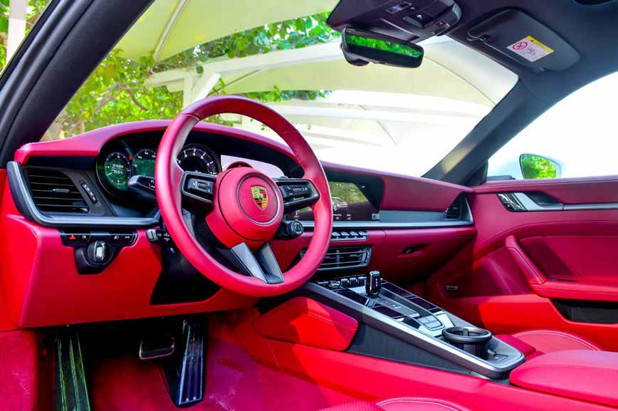 A novel feature of the flanks are the tucked in, electronic handles on the two doors that pop out when you unlock or place your hand next to them. 20-inch, high performance wheels are located on the front axle with 21-inch versions located on the rear axle. At the rear end, with its wide hips, the tail lights spread across the entire width of the vehicle, whilst the raised silver Porsche 911 lettering adds yet another touch of class. The stylish spoiler lies flat until it raises up automatically at a certain speed or manually at the touch of a button. The back glass extends to the very top of the 911, whilst a third brake light buried in the vents by the engine bay, adds another unique feature. Once inside the cockpit, it was clear that the class of the 911’s exterior flowed into the interior. All materials, finishing and trimmings used are of premium quality as is expected of any vehicle bearing the Porsche crest. The infotainment system includes a 10.9-inch touchscreen display, comprehensive connectivity and innovative assistance systems. The front seats were exceptionally comfortable and provided the driver with an optimal driving position. The rear seating area is significantly smaller than the front, however it is perfect for children, making this vehicle practical for everyday family use. These rear seats can be folded down to provide some internal storage space when required. This being a rearengine designed vehicle, the boot is located under the hood and this space provided allows you to store one decent sized item of luggage. Once we were out on the tarmac, the fun really began. This new 992 redesigned Porsche 911 boasts a 3.0 litre, six-cylinder boxer engine with bi-turbo charging that generates 450hp. Power transmission is handled by the new eight-speed dual clutch transmission (PDK).