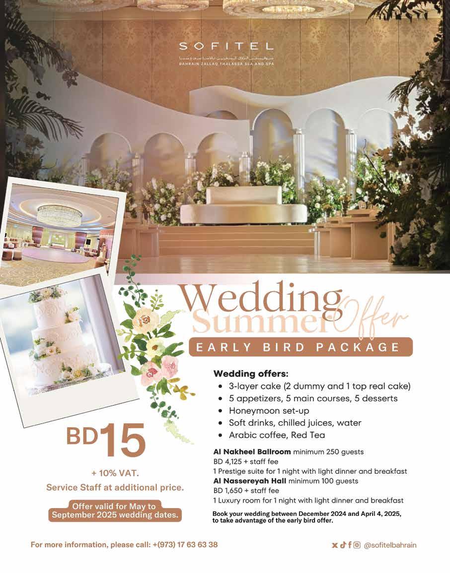 Experience the Duo Band & Friday Brunch, which features live entertainment, unlimited selected beverages and pool access. The brunch runs every Friday from 1pm to 5pm and is priced at BD32 net per person.