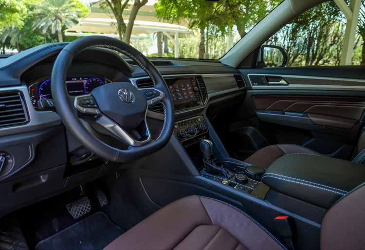 of the flanks draw the eye effortlessly from front to rear, with the silver roof rails and striking design of the 20-inch alloy wheels adding to the modern look of the vehicle. At the back end, an updated rear bumper, with IQ.Light and full-LED taillamps, finishes off the Teramont in style. We were fortunate enough to test drive a model with the coveted Highline trim. Inside this version you will find a clean and functional environment that has a premium feel to it. The driver’s 10-way adjustable and front passenger’s eight-way adjustable, ventilated power seats, in leather, offer an abundance of both comfort and support. The next generation steering wheel, also in leather, is well designed and feels great in hand. The driver’s controls have been positioned for optimal ergonomics, providing the most efficient driving environment possible. An eight-inch Touch Adaptable Infotainment System along with a Volkswagen Digital Cockpit 10-inch display, both offer easy accessibility to the vehicle’s various functions and information. A three-zone Climatronic AC and a panoramic sunroof will ensure you and your family are always kept cool and comfy. Customers can opt for either Highline or the prestigious R-Line trim, which can be ordered accordingly.