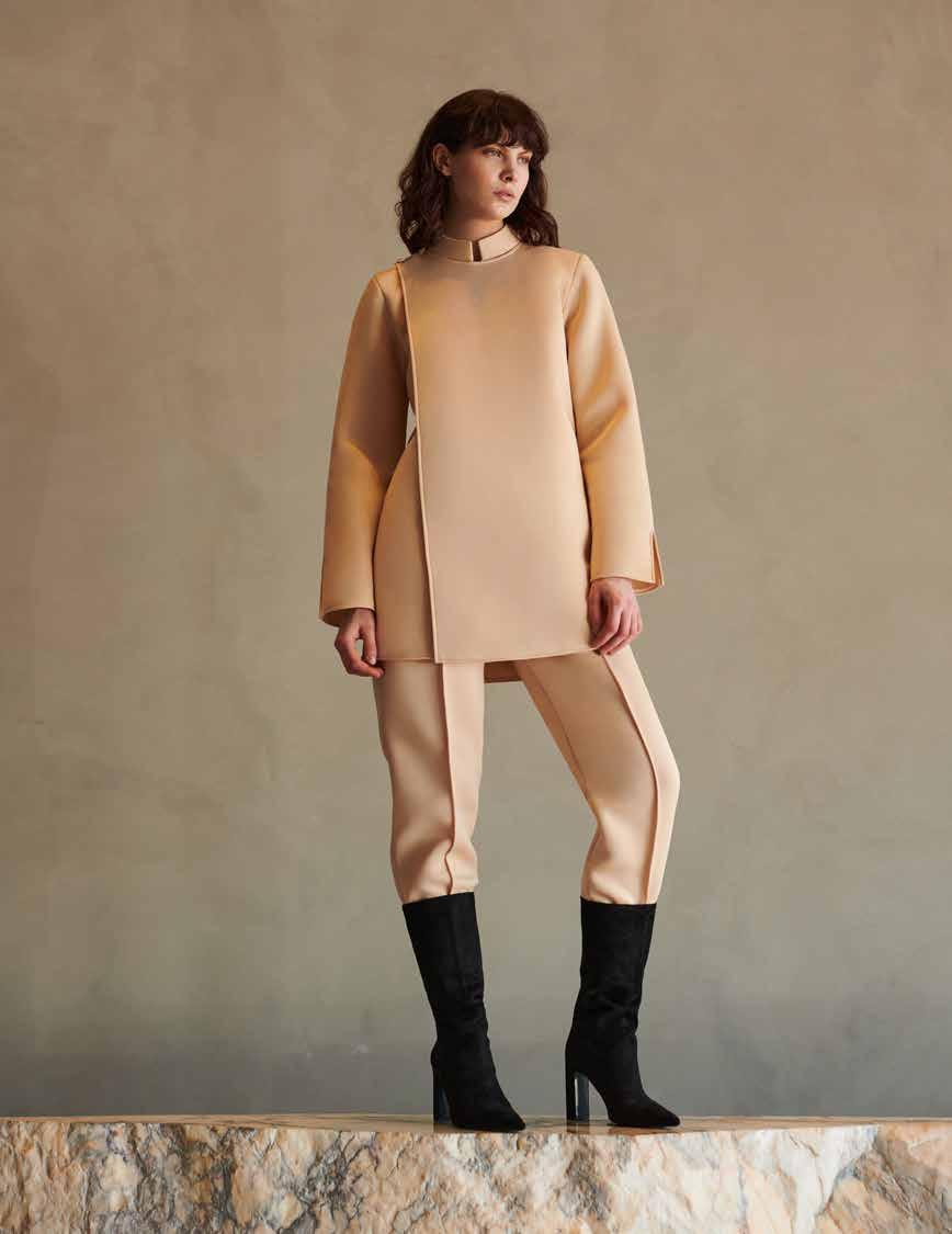 Playing with fabrics such as neoprene and suede, Serrb experiments with a 2D exercise by repeating and angling its unique inspiration. A colour palette featuring dark hues of black, grey, brown and green, fused with subtle hints of white and beige, symbolise the season’s aesthetic.