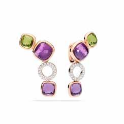 A second parure pairs purple amethysts with crisp green peridots – each stone showcasing Nudo’s distinctive 57 irregular facets – appearing to float within white diamond pavé circles. The asymmetric layout of mixed sizes creates the impression of colour drifting across the skin. Matching earrings carry the same ease – Milanese in spirit: considered, yet spontaneous.