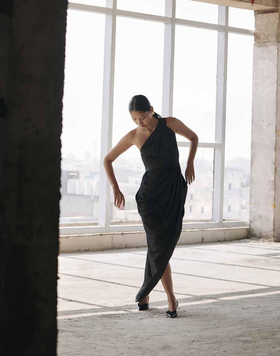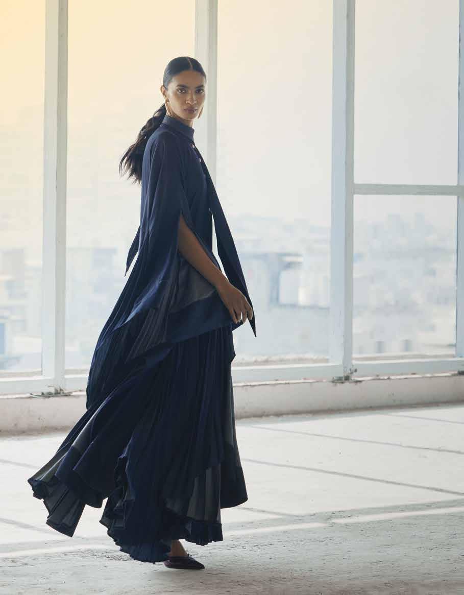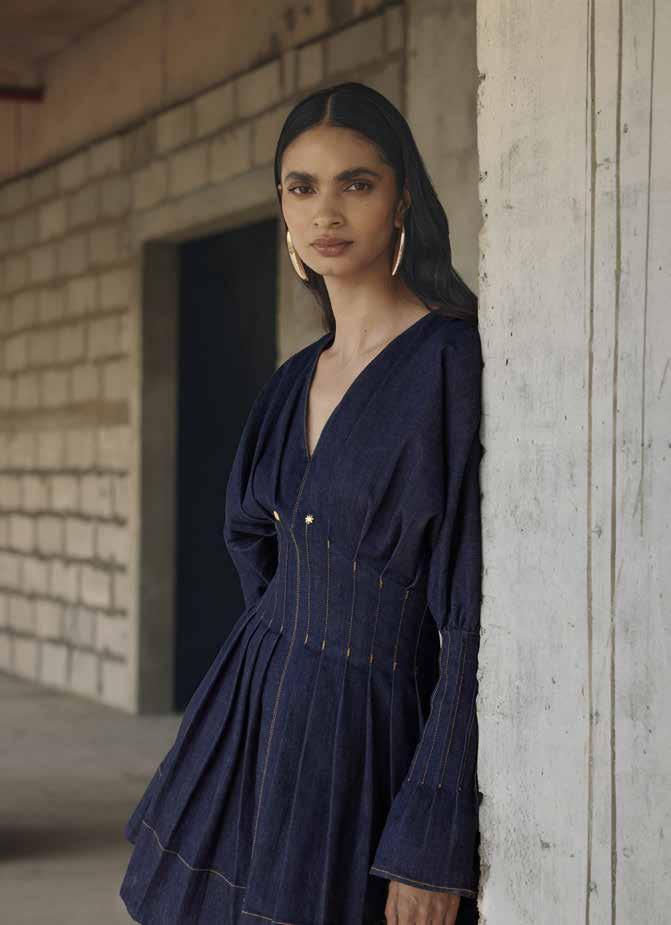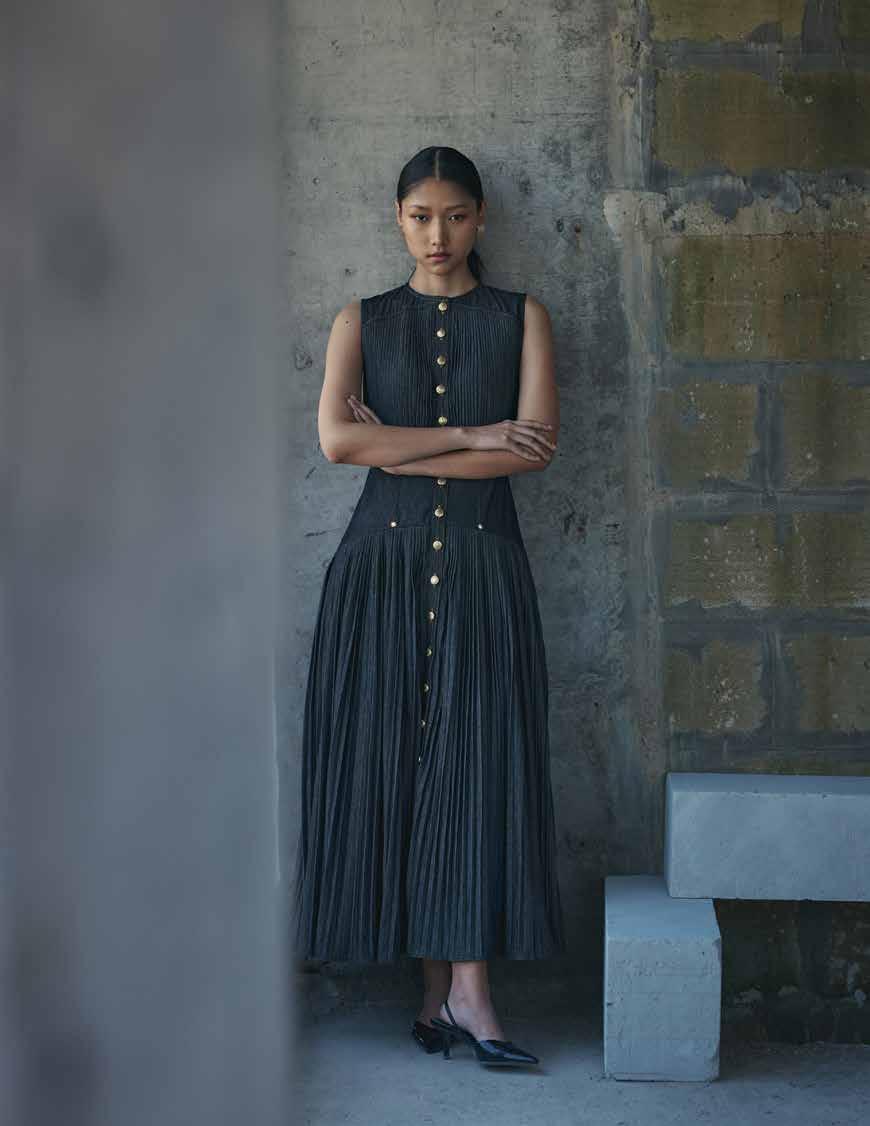 The collection centres around a curated selection of hero pieces – architectural dresses, sculpted bodices and fluid separates – each defined by sharp seams, controlled volume and rich indigo tones. Structured panels introduce clarity and form, while softer draping and pleating bring ease and femininity, creating garments designed to move with the body.