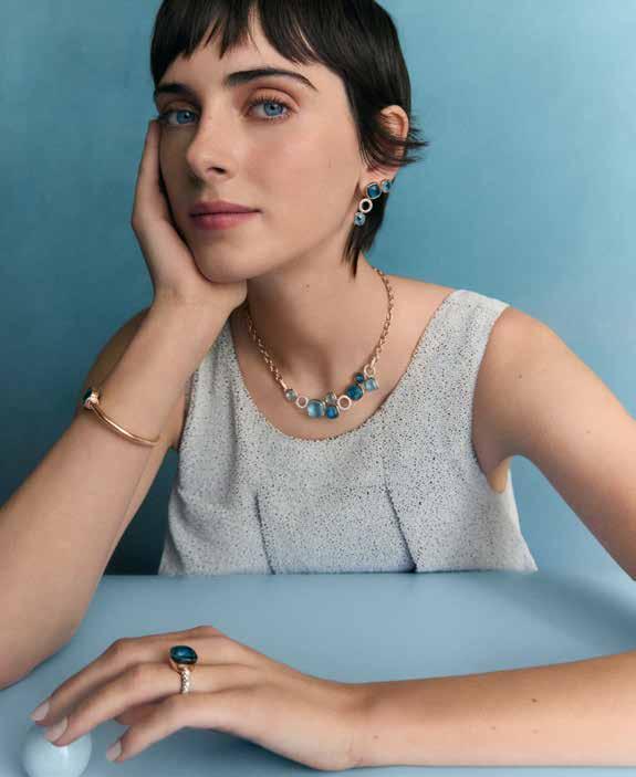 Nudo celebrates colour as the universal language of emotion. The new Nudo Rivière necklaces in rose and white gold unite the purity of Nudo’s signature with the vividly bright Clessidra cut, gathering a vibrant cluster of stones at the centre. Geometric elements play together: London blue and sky blue topazes meet white diamond pavé circles in a gently asymmetric cadence. For comfort and motion, a mobile rose gold chain completes the back and adjusts for a tailored fit. Coordinated earrings echo the palette in a measured cascade of light and colour.