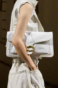 Baguette. This style features a structured, elongated silhouette, usually carried under the arm. This Coach Tabby comes in a bigger frame made with white denim for an intriguing touch.