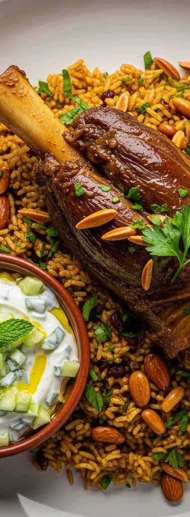 3. Serving: Once the rice is cooked, place it on a big plate and add the ouzi lamb shank on top of the rice mountain. Garnish with fried mixed nuts and serve alongside a cucumber yoghurt salad.
