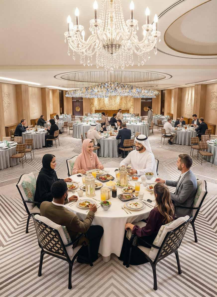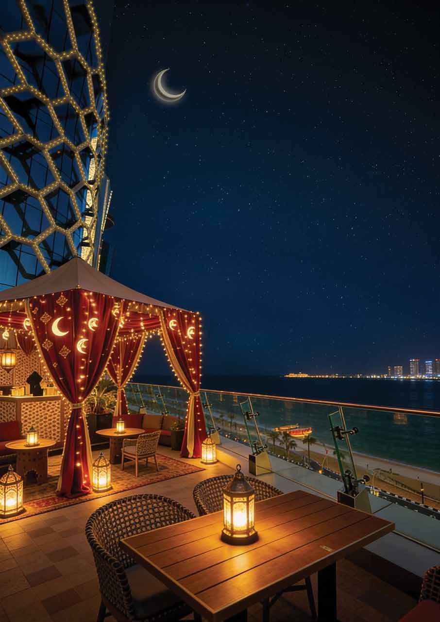 Experience the spirit of Ramadan at Zawaya Ramadan Tent in an open-air setting on the 8th �oor with sweeping views of Doha’s skyline, o�ering generous Iftar and Sohour bu�ets, inspired by traditional Ramadan favorites amidst a warm ambience.