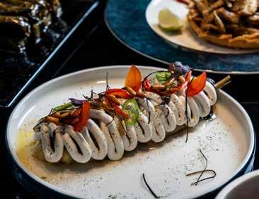 The menu is straightforward, and I personally liked that it offered a variety of small plates for sharing. I am an olive lover (any type), and if I see them on a menu, I tend to go for them. The mixed selection of green and black types came bathed in herbs, chilli, onions and garlic, very succulent and yummy just how I like them. We then tried the Burnt Leeks, charred on the outside and moist and juicy on the inside. This was accompanied by toasted hazelnuts and whipped ricotta, which added a delightful contrast of creamy, light texture with rich, nutty, earthy notes, creating a sweetsavoury balance to the dish. My dining companion couldn’t stop raving about how delicious it was. We also ordered the Charred Asparagus served with runny smoked egg yolk and sauce vierge (an uncooked French sauce typically made with tomatoes, olive oil and fresh herbs such as parsley). The vegetable was crunchy, the way I like it, and the flavour profile played with the deep, buttery richness of the yolk, with the fresh, acidic notes of the sauce adding complex layers to the grassy hints of the asparagus – it was my turn to be enthusiastic about how divine it was.