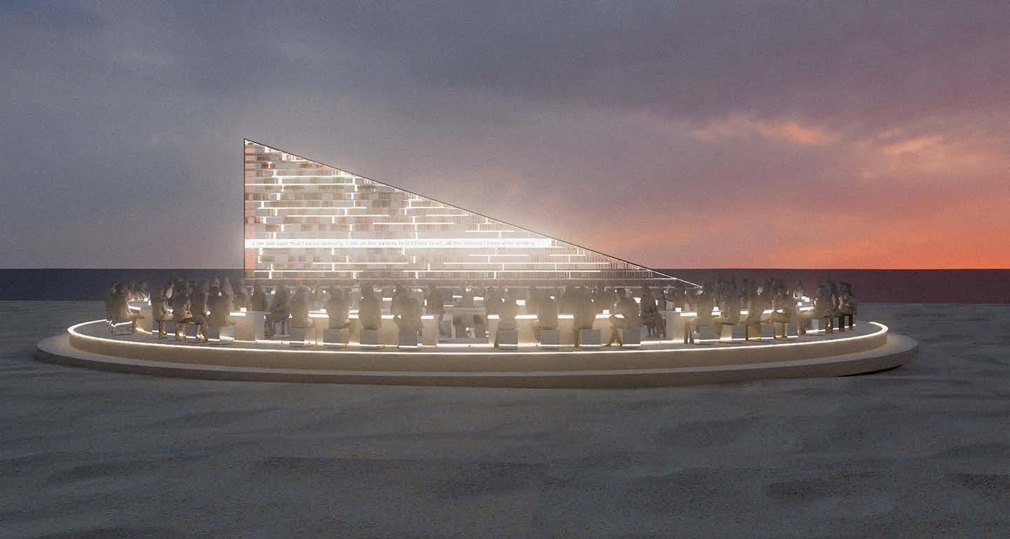 year. It reflects the artist’s reading of Umberto Eco’s phrase: Books are the compass of the mind, pointing toward countless worlds yet to be explored, and Jorge Luis Borges’ words: “I am not sure I exist actually, I am every book I have ever read, as well as those of James Baldwin: It was books that taught me that the things that tormented me most were the very things that connected me with all the people who were alive, who had ever been alive.” Es Devlin has said “I have always experienced libraries as silent, intensely vibrant places where minds and imaginations soar, while clutched like kites by their seated bodies. I sense the synaptic connections being forged, the resonances and associations at play within the minds of a temporary community of readers. This installation seeks to express the vitality of the library through a series of encounters between viewers revolving to meet one another through language around a circular collective reading table. Library of Us is a community of books, peacefully sharing one slowly revolving bookshelf, all silently beaming their contrasting points of view, all allowing for the other to exist, as they turn together between the sun, sea and sky.”