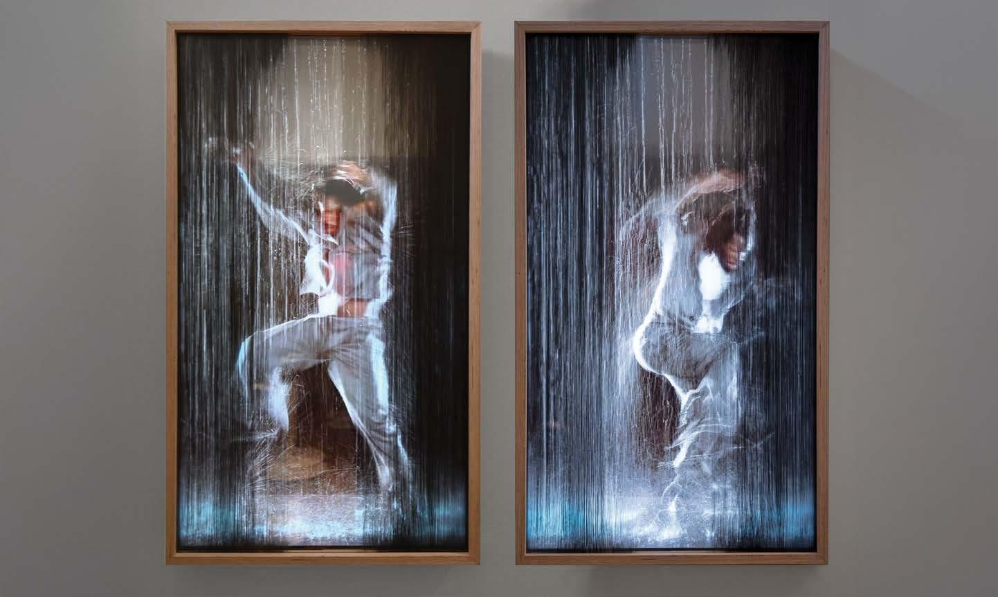 Es Devlin has maintained a studio practice of drawing, painting and making alongside her three-decade-long career in large scale installation artworks and stage design. Many of these drawings, paintings, maquettes and cardboard sculptures are featured in her sculptural monograph, An Atlas of Es Devlin (Thames & Hudson, 2023). The works exhibited in Tracing Time have been made over the past two years in parallel with some of the artist’s recent large scale installation works and stage designs. In Edge Dance, Surfacing and Home is the other we carry inside us , Devlin explores the dialogue and dance between the edges of the human form and the architecture that surrounds it. Water becomes an additional layer in some of the works, expressed as suspended painted glazes (in Drawing not drowning ), rain filmed in slow motion (in Surfacing ) and the filmed surface skin of a swimming pool (in Not Drowning ). These works draw on Devlin’s earliest memory — of not drowning in the River Thames in London aged three, and her reading of a transcendent, near-drowning episode in Herman Melville’s