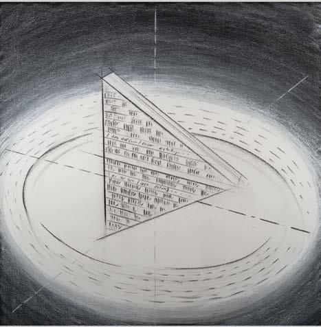 Moby Dick Surfacing draws on the themes of drowning and emergent identity in the novels of Margaret Atwood. The Library of Us series, including Iris , Compass and Sketch, was made in the studio in preparation for the monumental Library of Us installation commissioned by Faena Art on Faena Beach. Laser cut circular voids in 6 layers of plywood are offset to form Iris. A mirror laminated triangular extrusion revolves around a vertical axis in Compass Both works are printed with layers of book and play titles and draw on Devlin’s reading of Umberto Eco’s phrase A Library is a Compass of the Mind, and Jorge Luis Borges’ text I am not sure I exist actually; I am every book I’ve ever read… while Sketch documents the initial idea for the geometry of the work in pencil, ink and charcoal. Nevada Ark and Redraw the Edges of Yourself were made in 2023 and 2022 respectively. They draw on Devlin’s observational drawings of the endangered species of London and Nevada and express the porosity she felt between the edges of her drawing hand and the geometry of each more-than-human being.