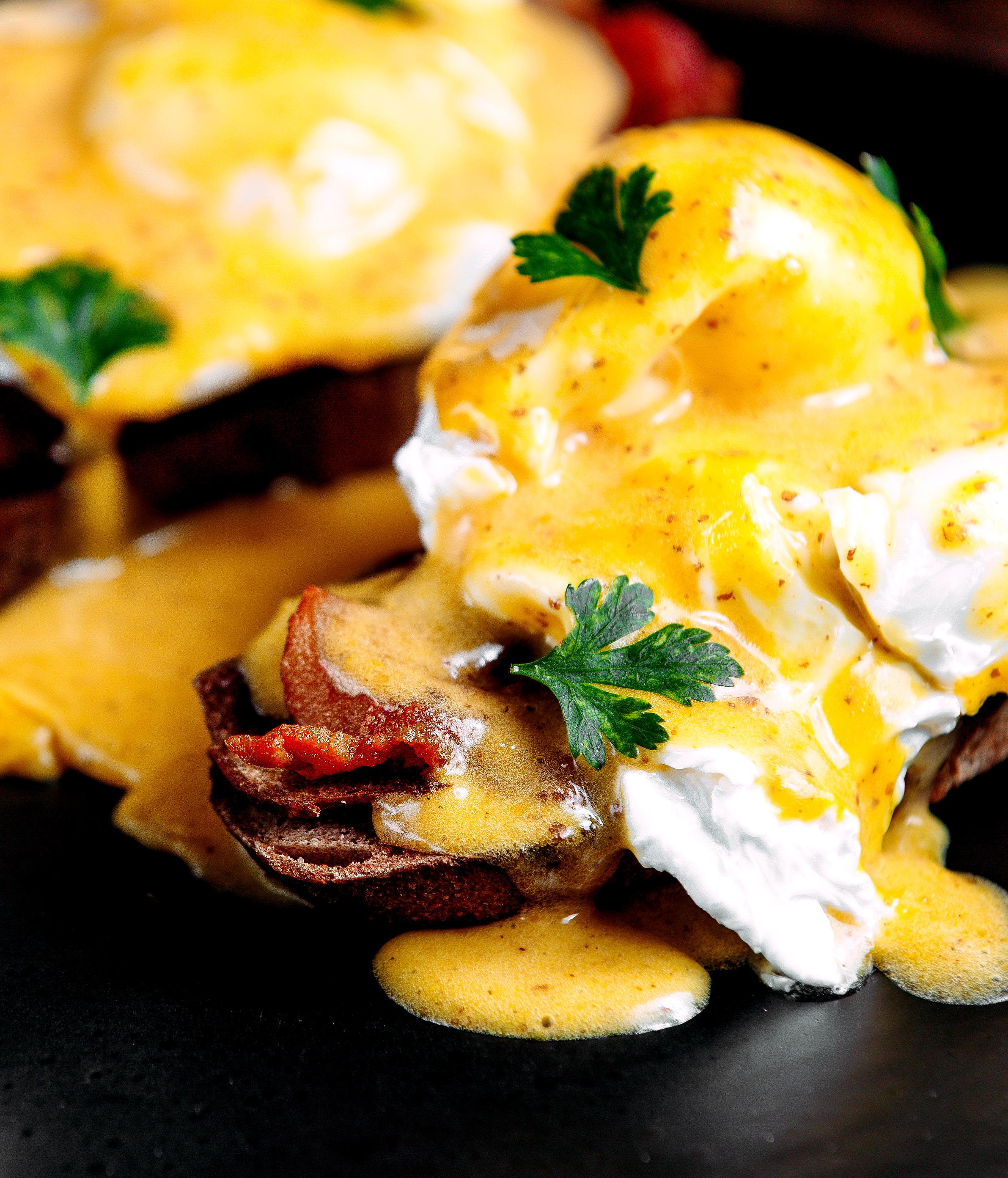 English muffin, baby spinach, macon, poached eggs with hollandaise sauce