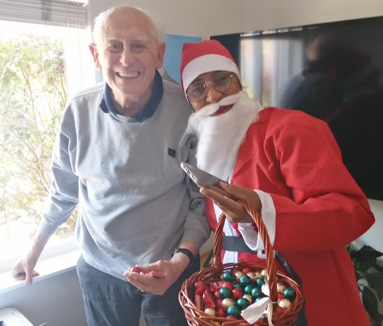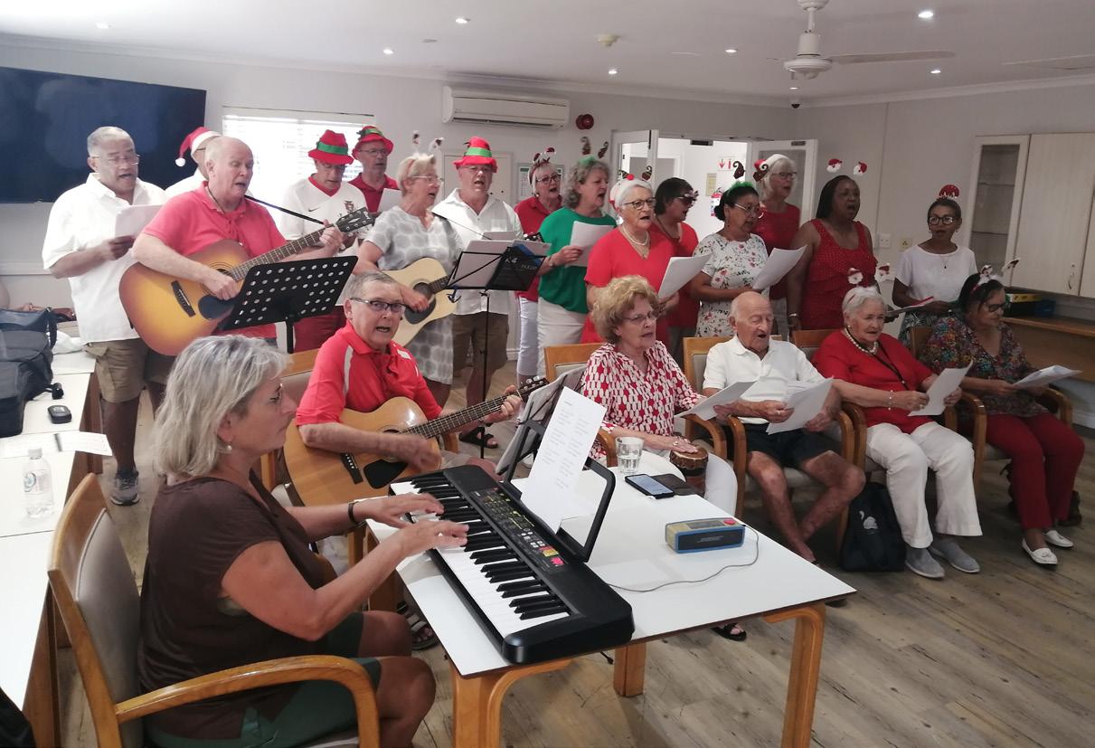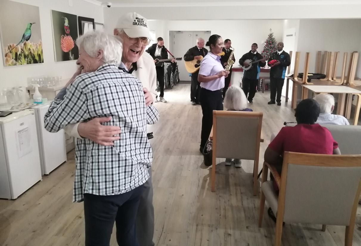 The Gospel Bells, a men’s a cappella group, had residents clapping, dancing, and tapping their feet to familiar Christmas and New Year songs, creating an atmosphere of energy and shared delight. Every second Friday afternoon, Happy Hour is enlivened by Des Poole on guitar, playing jolly tunes that encourage movement, singing, and dancing.