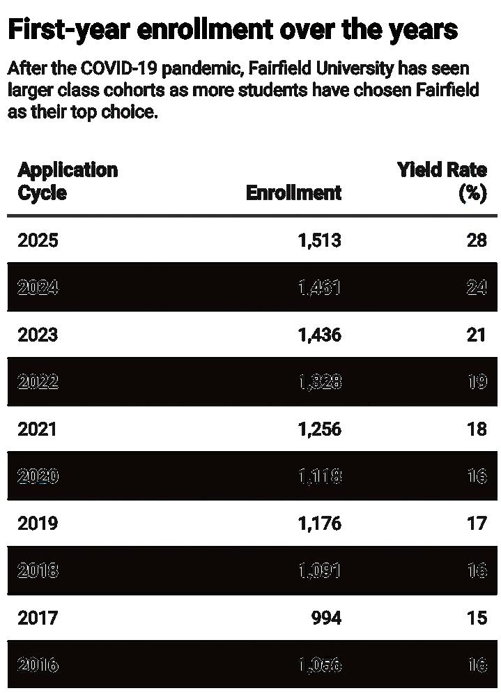 “As we [have] grown in national prominence, more students are selecting Fairfield as their first choice,” Cory Unis, Fairfield’s vice president for enrollment, said when the university announced the new class profile at the end of March.