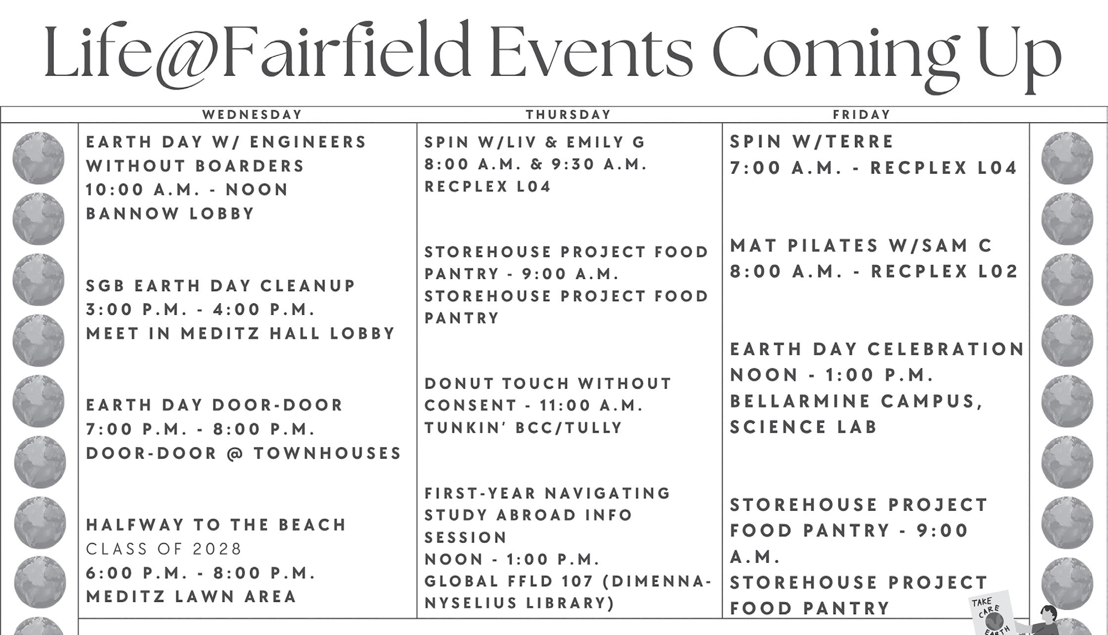 The Earth-friendly week’s events will conclude with an off-campus service opportunity on Saturday, April 25, from 1 to 3 p.m at Cove Island Park in Stamford, Conn.