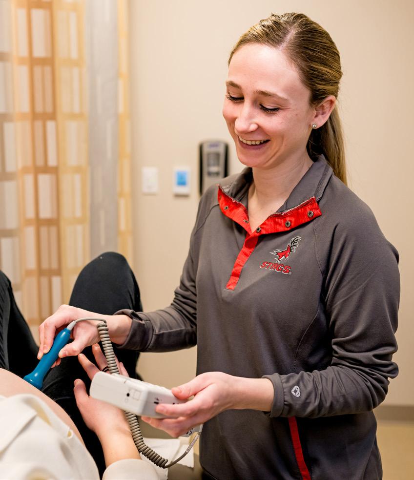 Pictured above: Associate professor and Nurse Midwifery DNP program director Jenna LoGiudice ’06, PhD, CNM, RN, FACNM (on left), delivers a sim baby with the help of students
