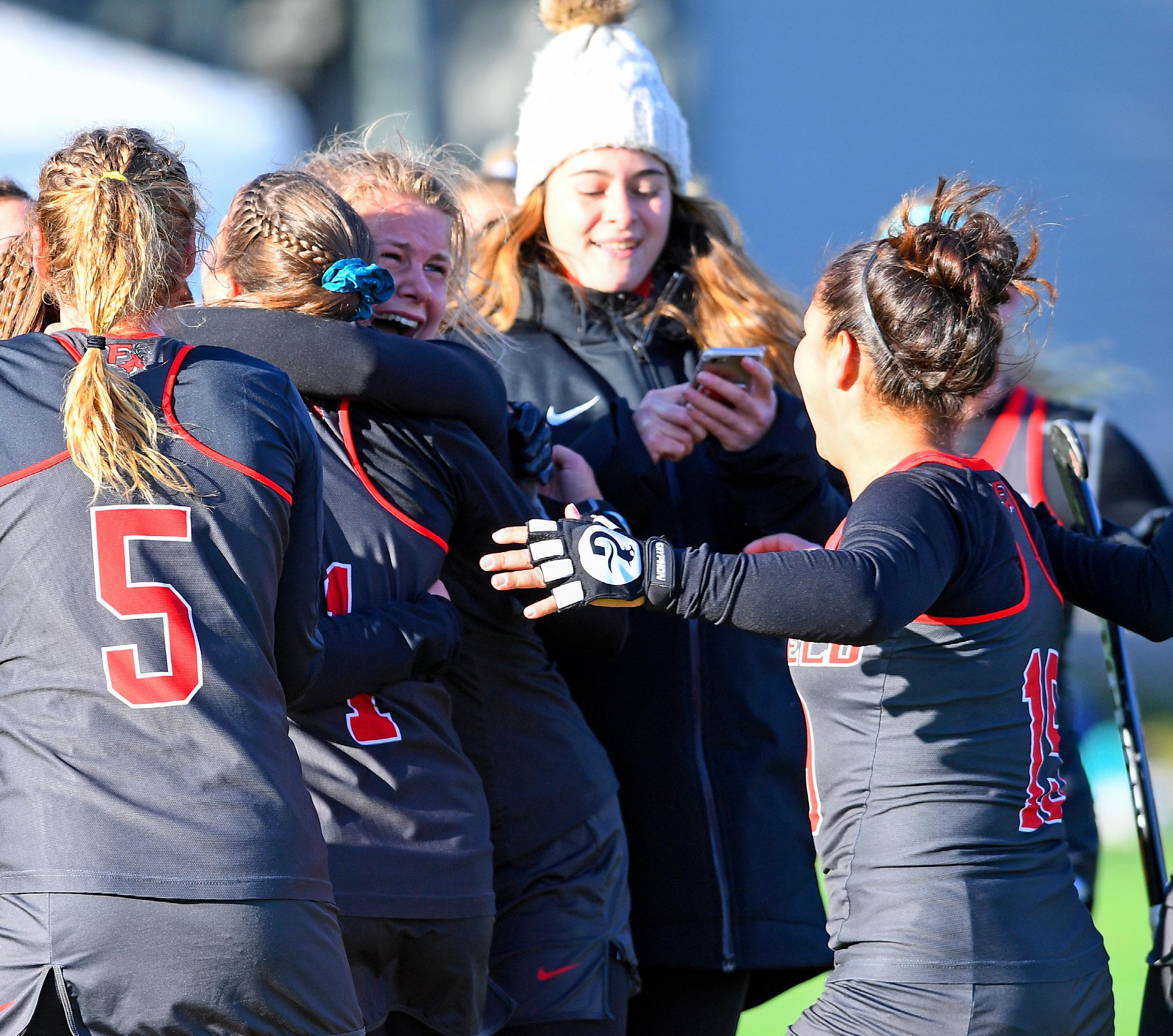 Janelle Brown ’24, a spark plug guard for the Stags, celebrates with fellow teammates at a winning game against Stonehill.