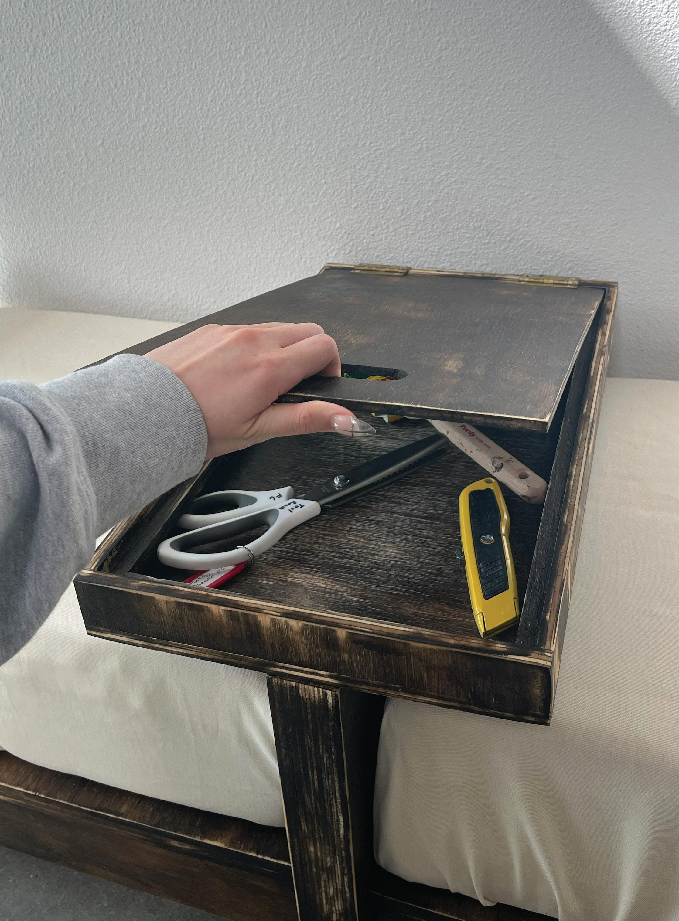 The design defines personal space without restricting flexibility. A removable table with integrated storage creates an adjustable boundary, while floating armrests maintain a lightweight presence. Soft, curved forms and an aged material finish introduce comfort and familiarity in shared settings.