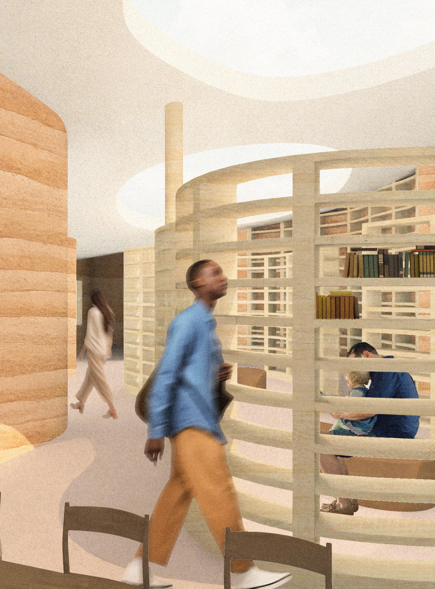 The interior shifts from open to compressed through a concave section and lowered roofline. Walls guide movement toward central reading areas, where overhead daylight concentrates. This creates a controlled, quiet environment for focused use.