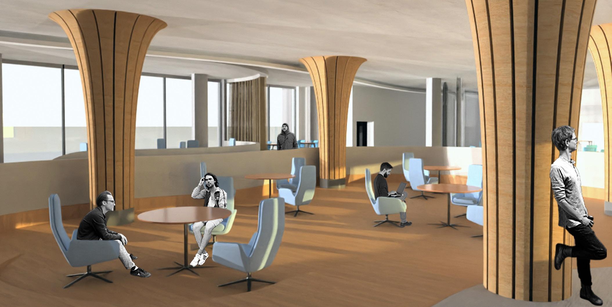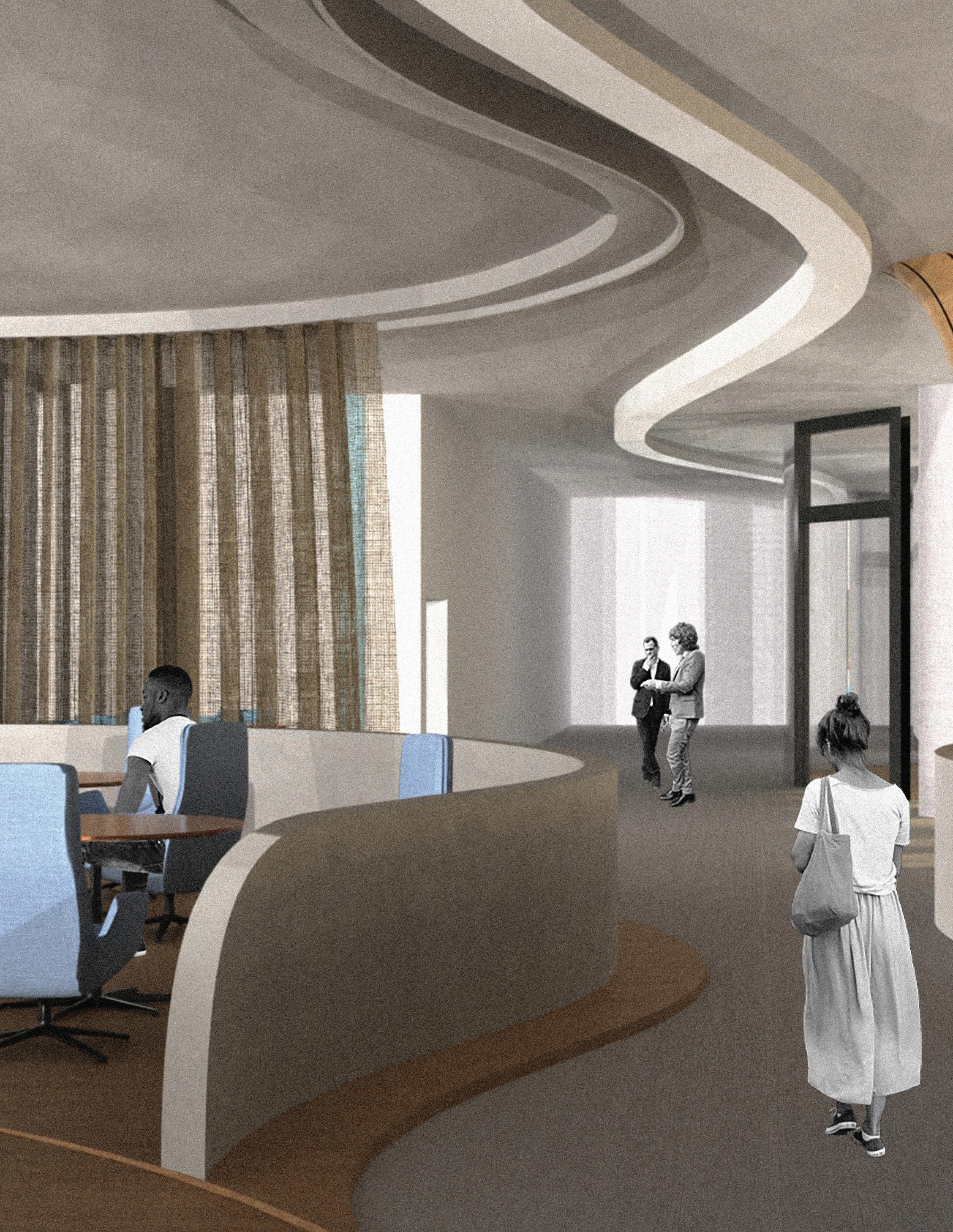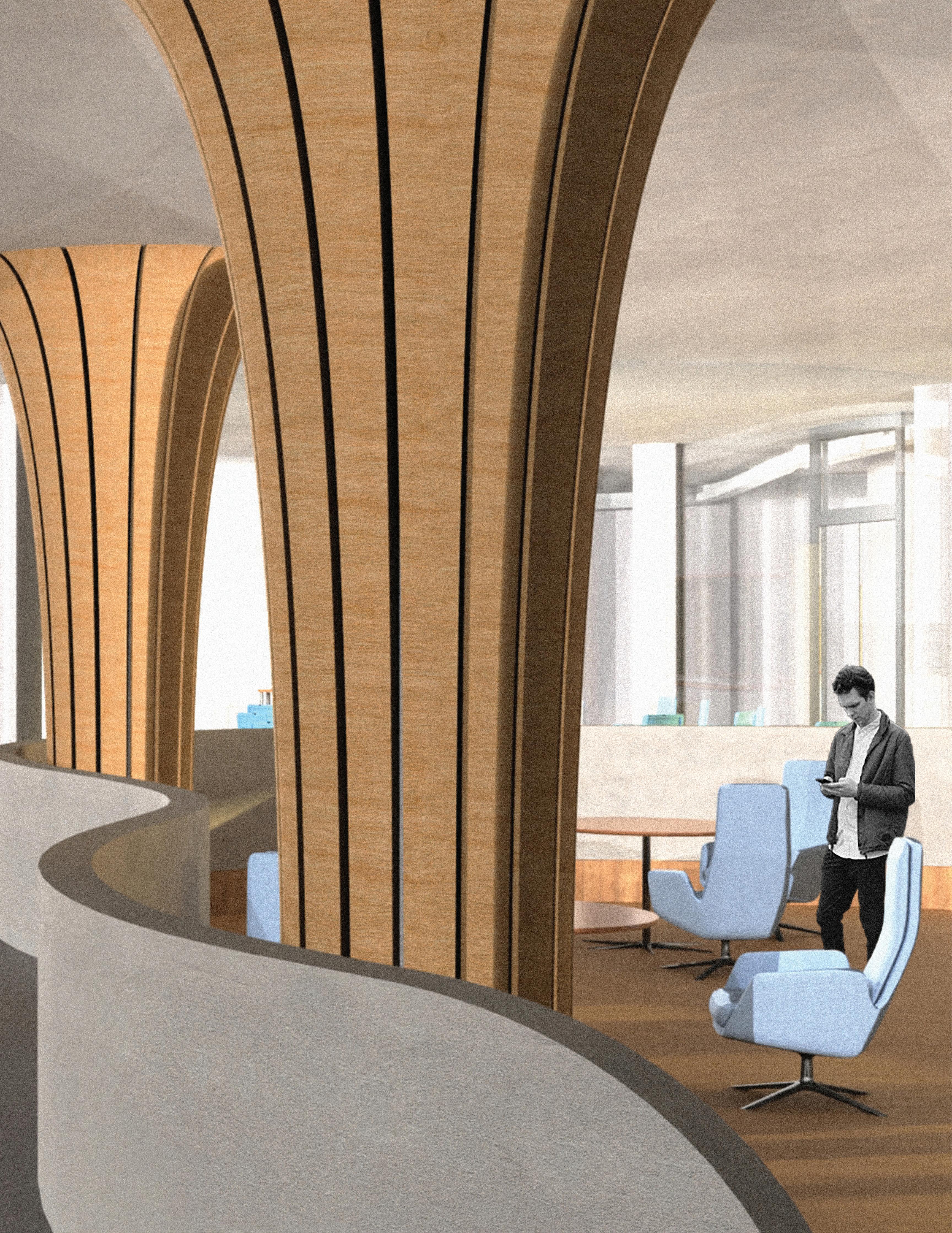 Undulations organize space through changes in height, creating compression and expansion. Taller volumes support quiet, reflective use, while lower areas encourage collaboration. These shifts also help contain sound and guide movement across the forum.