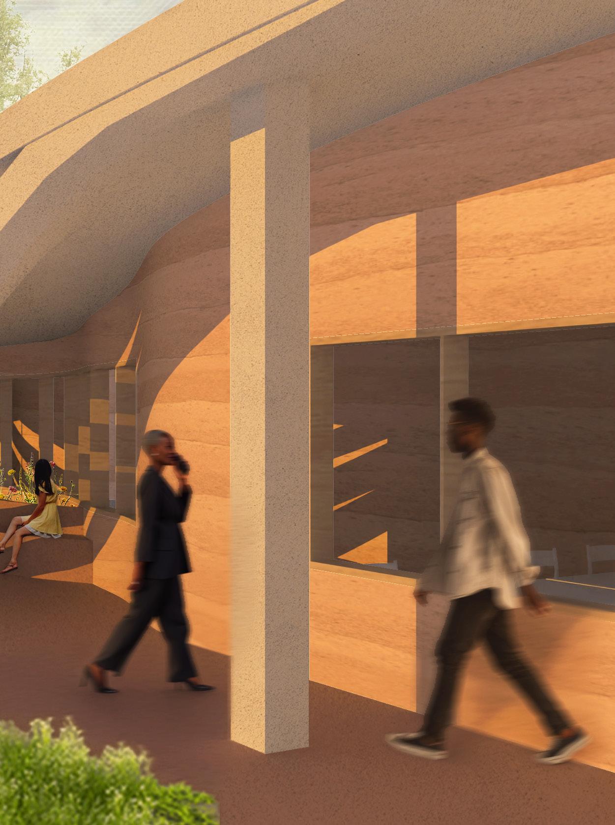 The project uses rammed earth, sourced from Central Valley soil, to form a shared civic space defined by a scooped, shaded facade that organizes movement and use across the site.