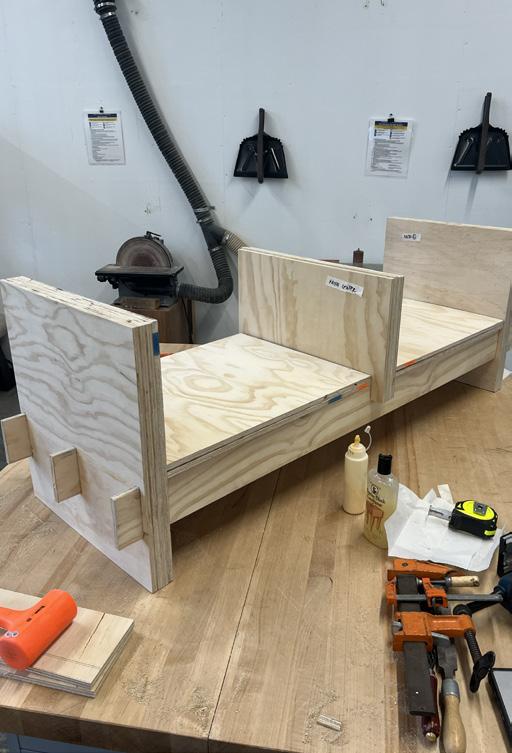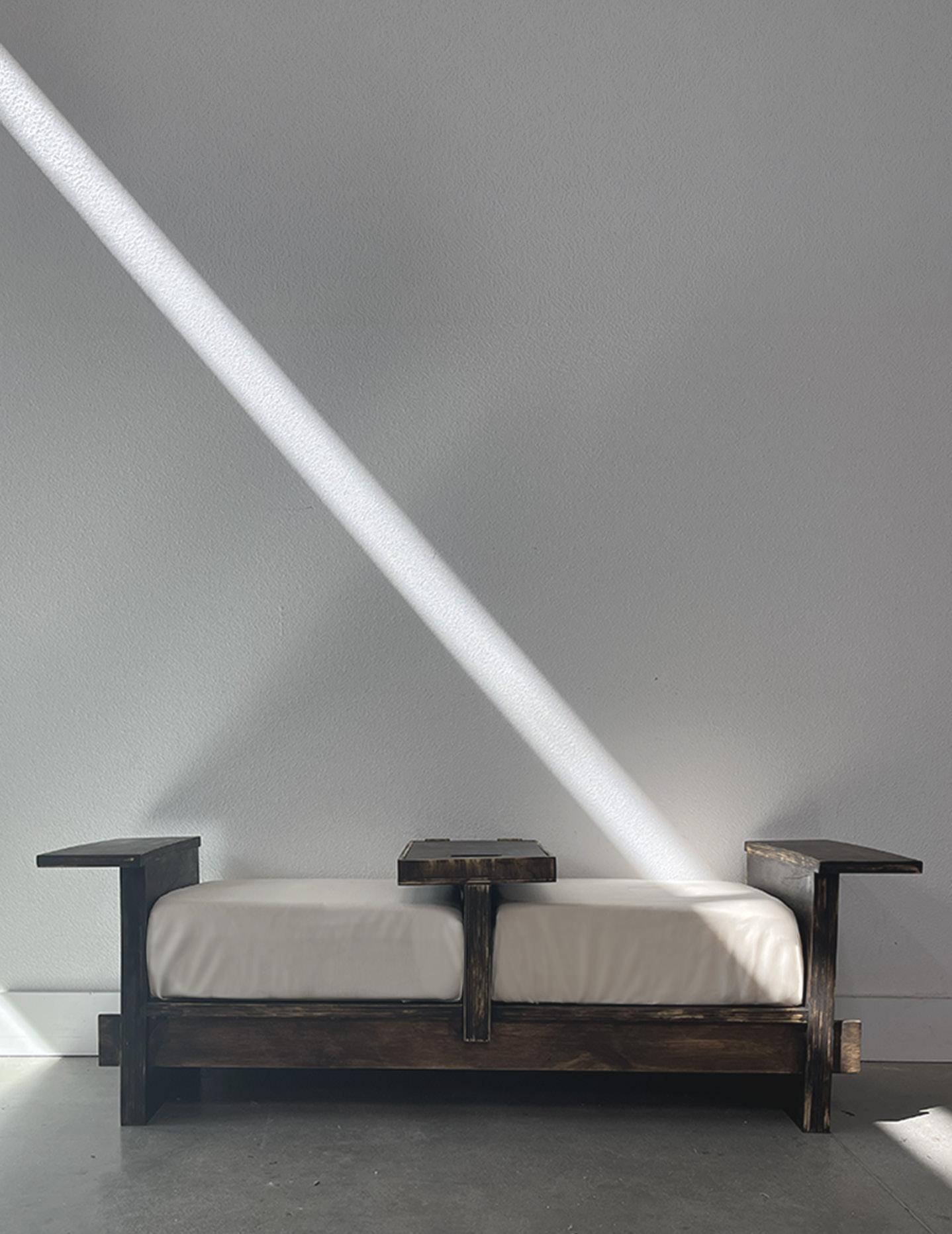 Designed as a functional furniture piece for waiting environments, the bench supports both pause and productivity within transitional spaces. It operates as a “third space,” accommodating use before class, in offices, or within cafés.