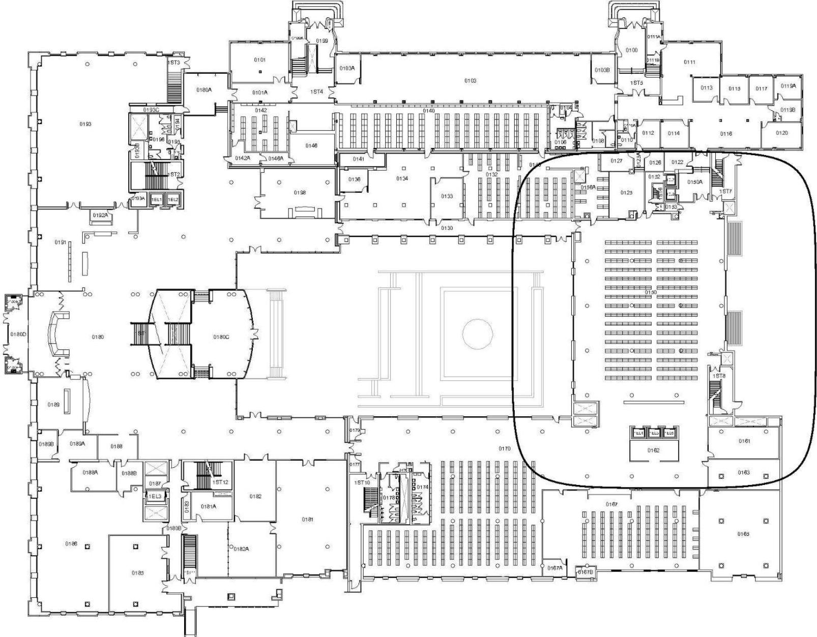 The plan guides movement through expanding and contracting paths, with collaborative programs at the center and quieter study areas along the south edge near the trees. It includes study spaces, conference rooms, open work areas, and a multi-use auditorium. A café at the main entrance connects to an interior courtyard, allowing indoor–outdoor use and quick access without disrupting the forum.