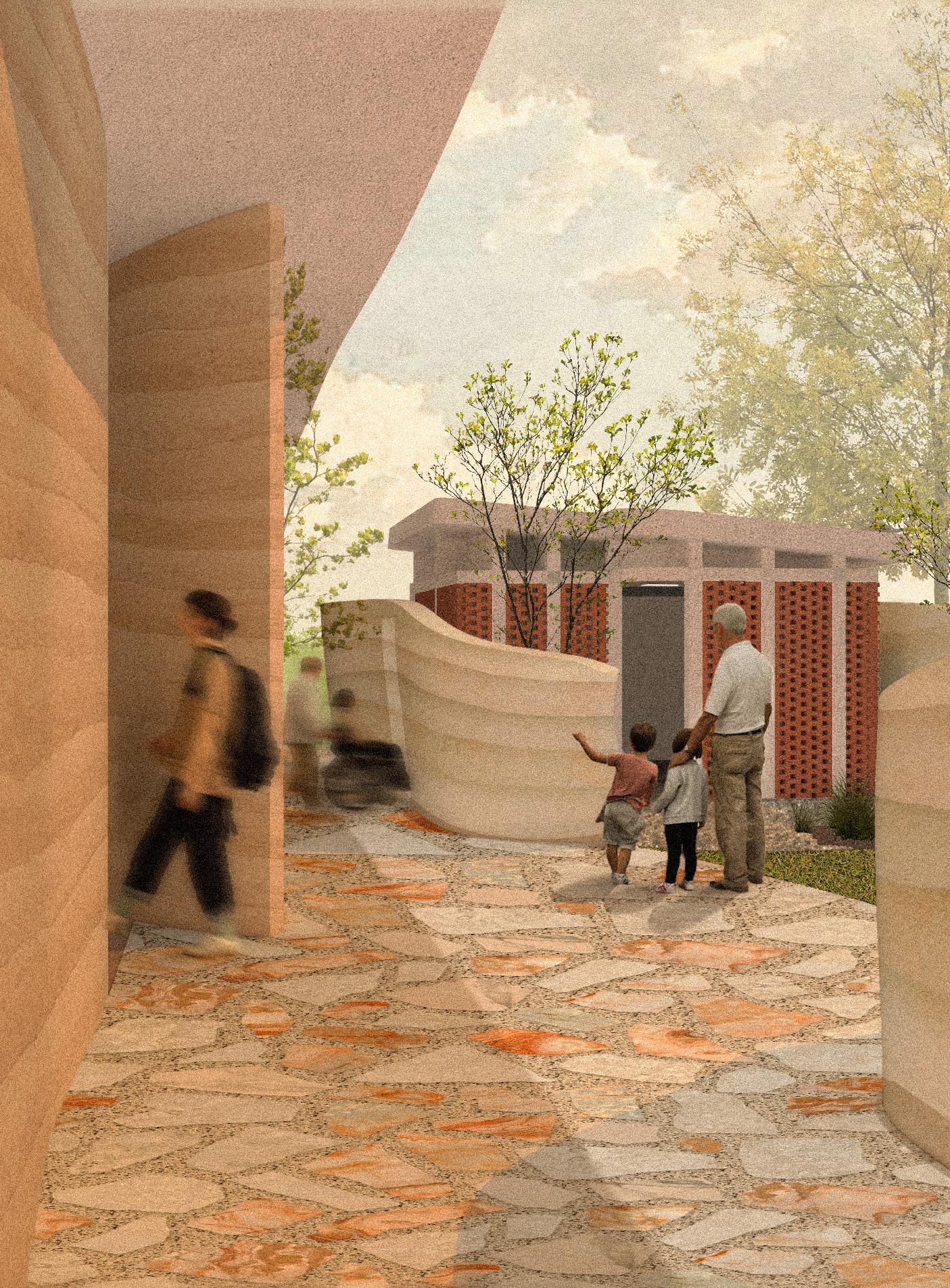 The primary facade faces east, south, and west, limiting solar exposure during peak heat hours. Its sloped surface supports sitting, circulation, and shade, serving as both an enclosure and a pathway. The form references the Central Valley basin, directing movement inward.