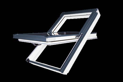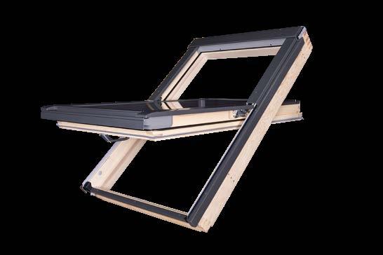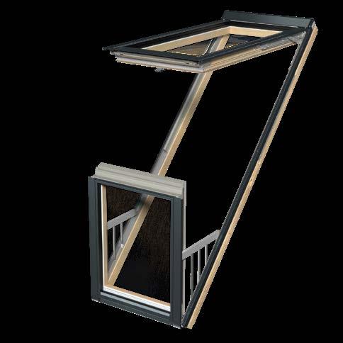 Inovativní, velké, dvoukřídlé střešní okno, ve kterém otevřená křídla vytváří balkon. Horní křídlo se otevírá výklopně vzhůru až do úhlu 45°, spodní otevřením vpřed umožňuje neomezený přístup k okraji okna.