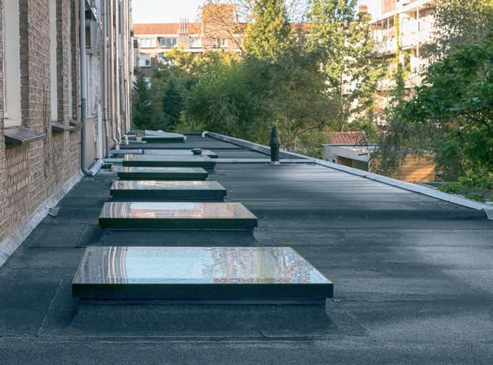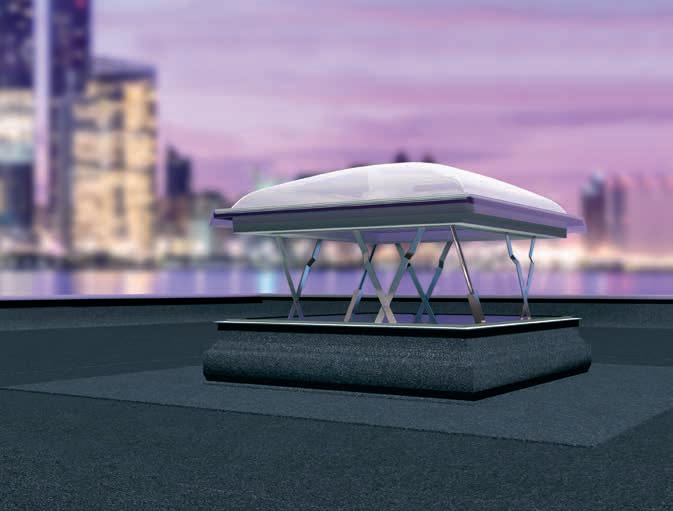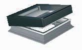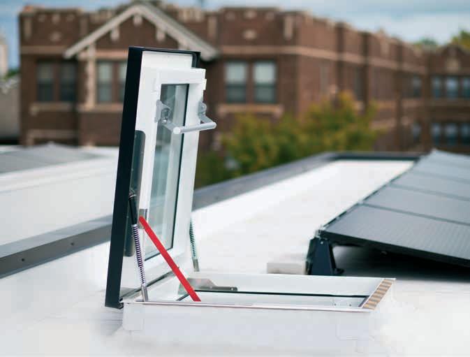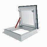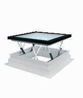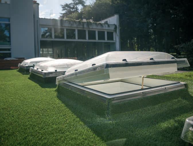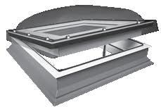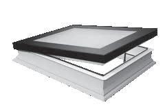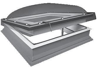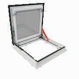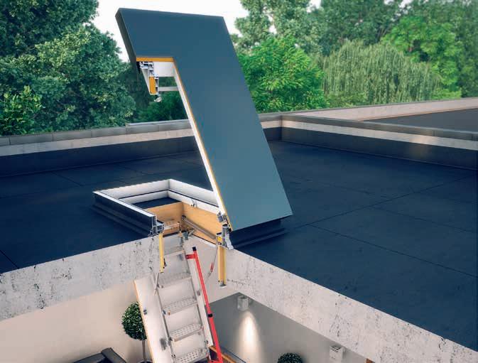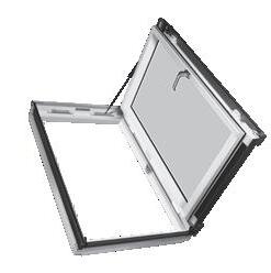 2 -Una trampilla térmica tipo panel sándwich, con un coeficiente térmico Uw de 0,67; de varias capas recubierta por el exterior con aluminio en color RAL 7022 y equipada con juntas de goma. La hoja se abre hasta 60°. Los muelles de gas facilitan la apertura y el cierre de la trampilla y también permiten mantenerla en la posición abierta. La cinta antideslizante en la parte exterior del marco permite el acceso seguro a la cubierta horizontal.