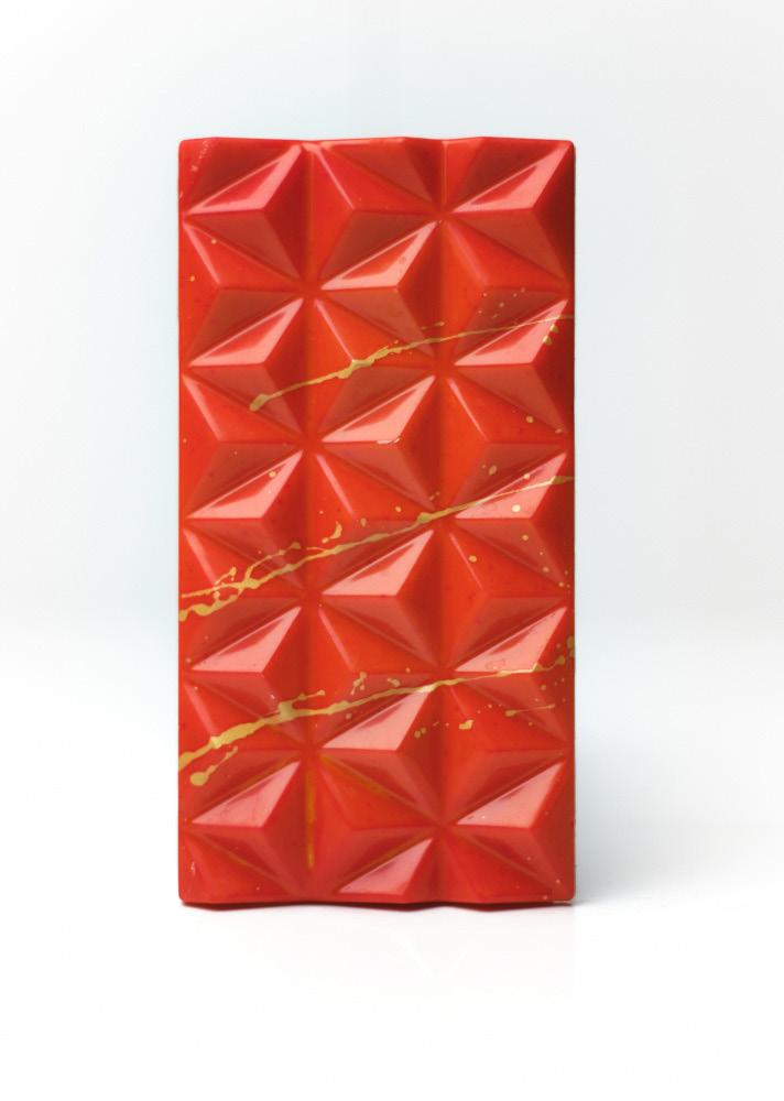 Denne lekre sjokoladeplaten av hvit sjokolade er farget med gull og rød. Den inneholder en frisk smak av bringebær.