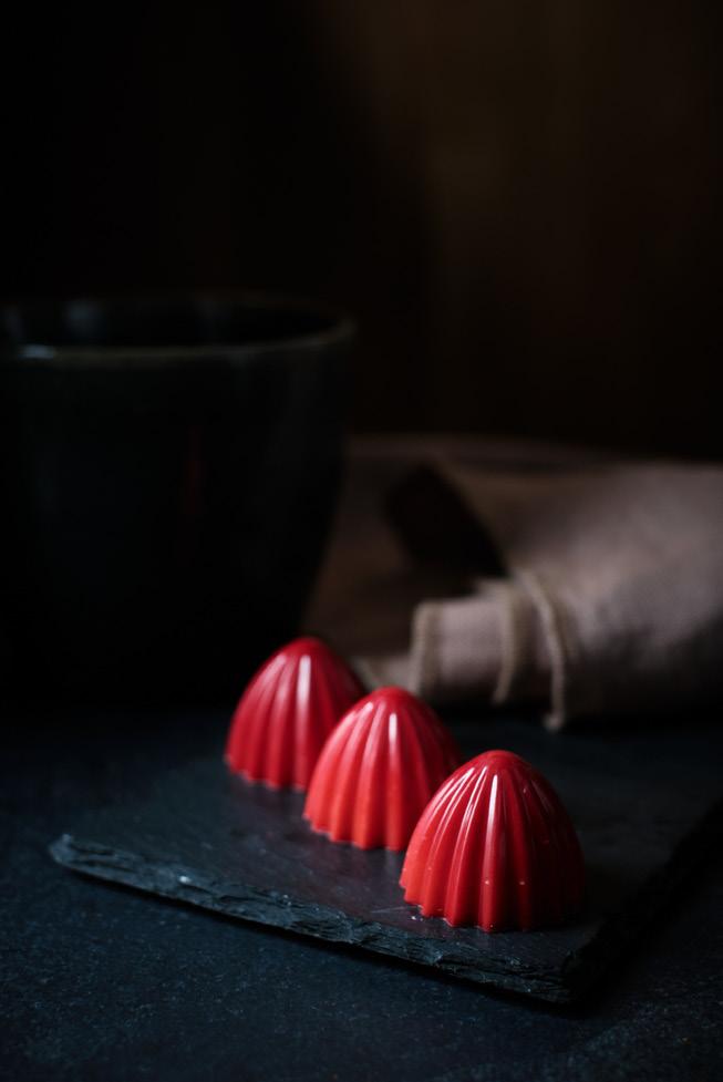 En av 4 populære konfektbarer. Denne består av ett skall av melkesjokolade, og er fylt med bringebær pâte de fruit og en biscottiganasj. En herlig kombinasjon. Og godt likt av både barn og voksne.