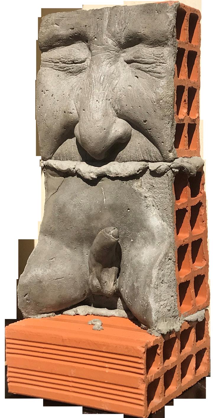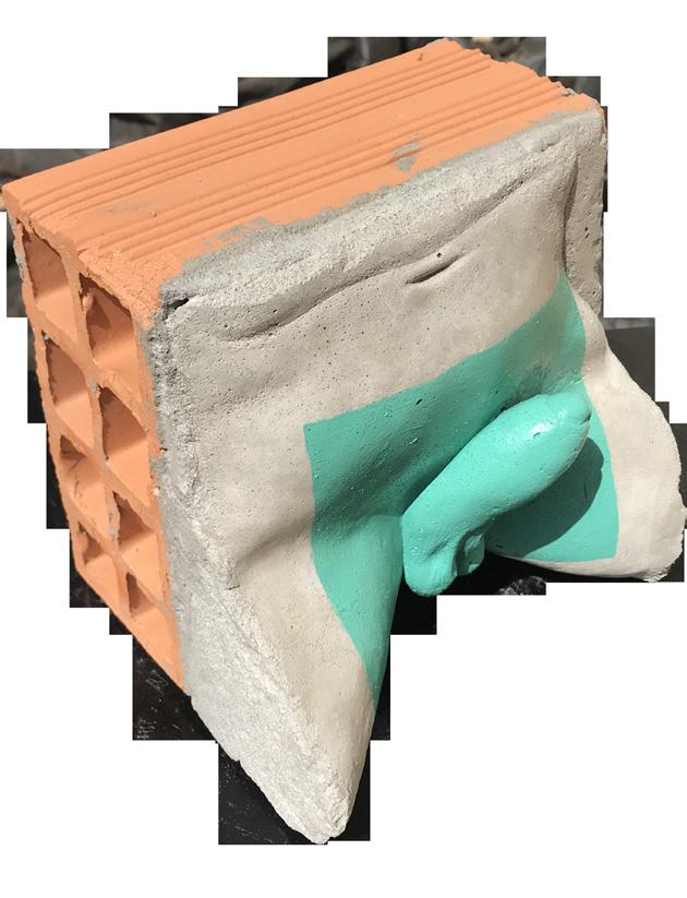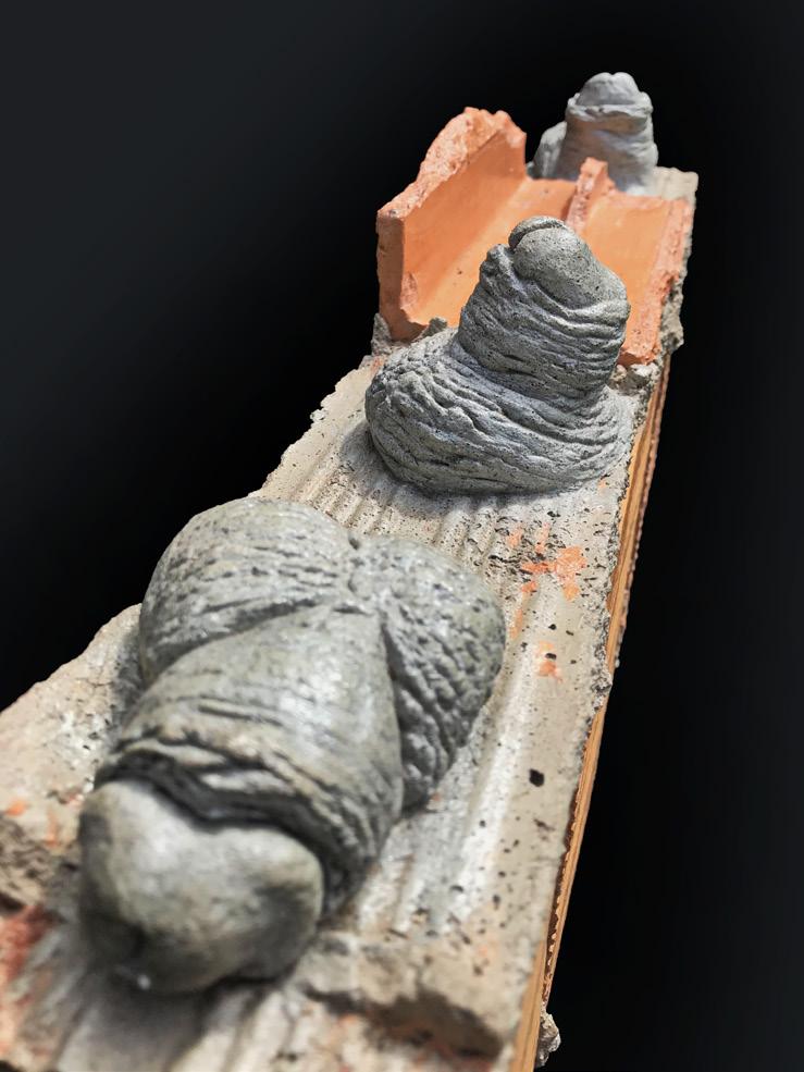 Acima, Tabu: A censura da pika e, ao lado, Totem: O rosto e a pika (2023), ambas da série A (in)s(piração) é (trans)(forma)(cio)nal, concreto e tijolo furado, 2022.