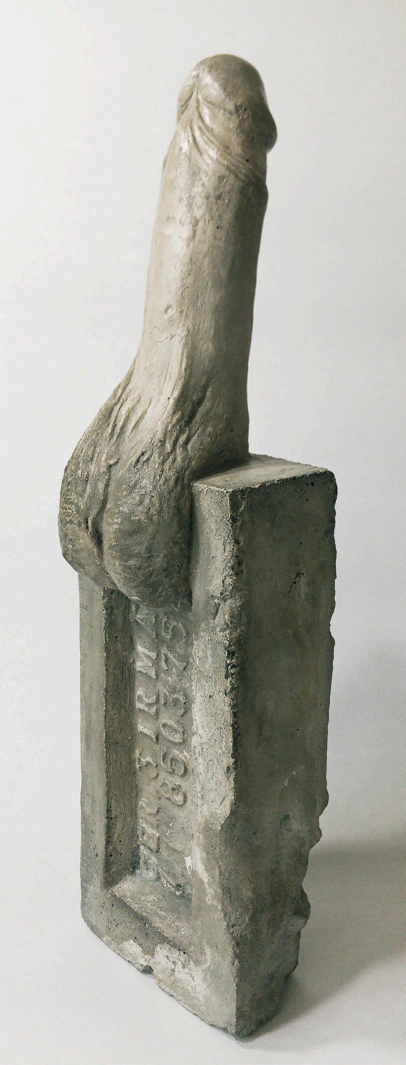 Para ele, fazer um falo de concreto é a combinação ideal: ambos falam de rigidez, imperfeições e crueza. Algumas de suas peças ainda possuem pequenas armaduras internas emulando o concreto armado usado na construção civil.