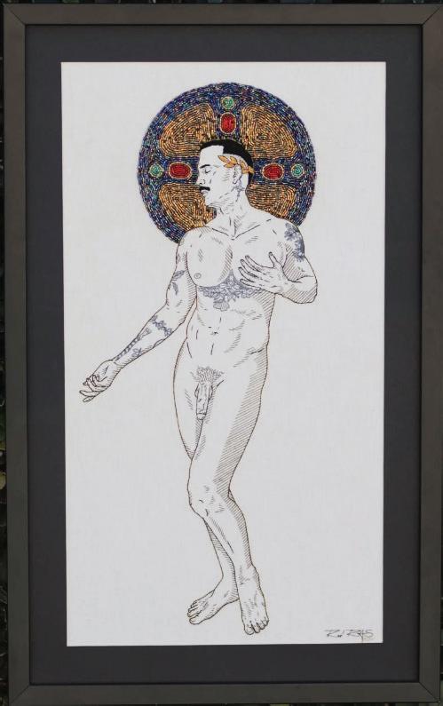 Eu sempre quis ser um santo (2024) bordado artesanal com miçangas e aplicação de folha metálica, fios de algodão, poliéster e nylon sobre tela de algodão